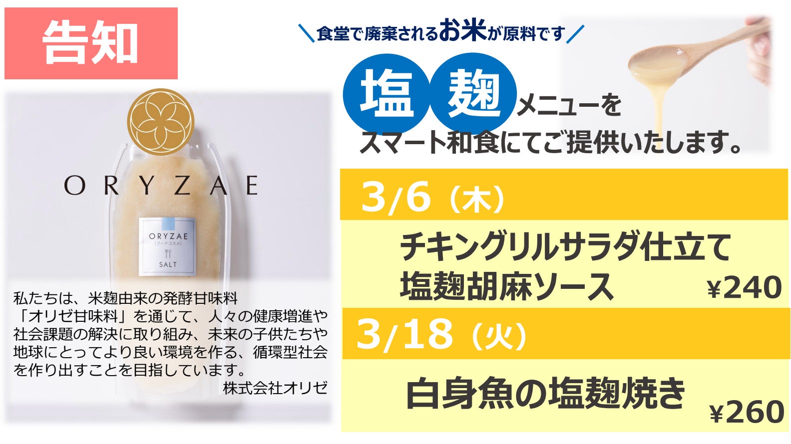 食堂で余ったごはんを塩麹にアップサイクルする企画の続編!アップサイクルした塩麹を使用したメニューが同食堂に初提供されました!
