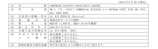 マーチャント・バンカーズ株式会社の香港子会社MBK ASIA LIMITEDは、今般、香港で主に法人向けに税務会計サービスを提供するCORPORATE ACCOUNTS CONSULTANCY LIMITED(以下、「CAC社」といいます。)との間で投資業務開発等に関する業務提携を行い、当社グループとして、香港における投資事業を強化いたしますので、お知らせいたします。