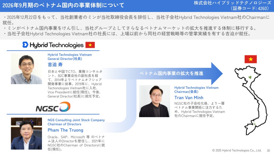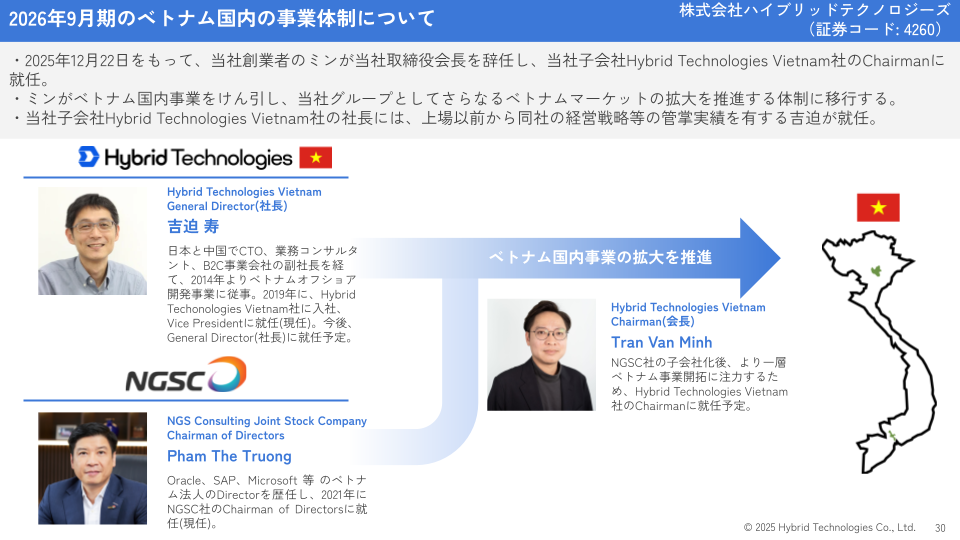 2025年12月22日をもって、当社創業者のミンが当社取締役会長、を辞任し、当社子会社Hybrid Technologies Vietnam社のChairmanに就任することとなりました。これは、ミンが当社グループのベトナム国内事業の発展をけん引し、ベトナムマーケットの拡大を推進できる体制が、現在の当社の成長に適した体制であると判断したためです。