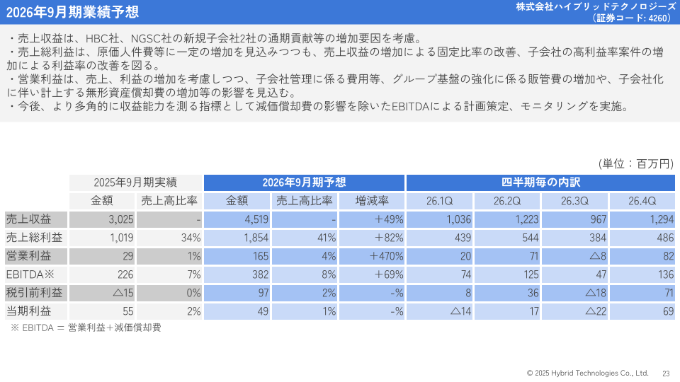 2026年9月期は主に、2025年8月にグループインした、事業戦略コンサルティングを営む株式会社ハイブリッドビジネスコンサルティング(HBC社)、及び2025年10月1日に子会社化した、ベトナム国内で包括的なIT支援事業を営むNGS Consulting Joint Stock Comany(NGSC社)の通期貢献等による増収・増益を考慮しました。