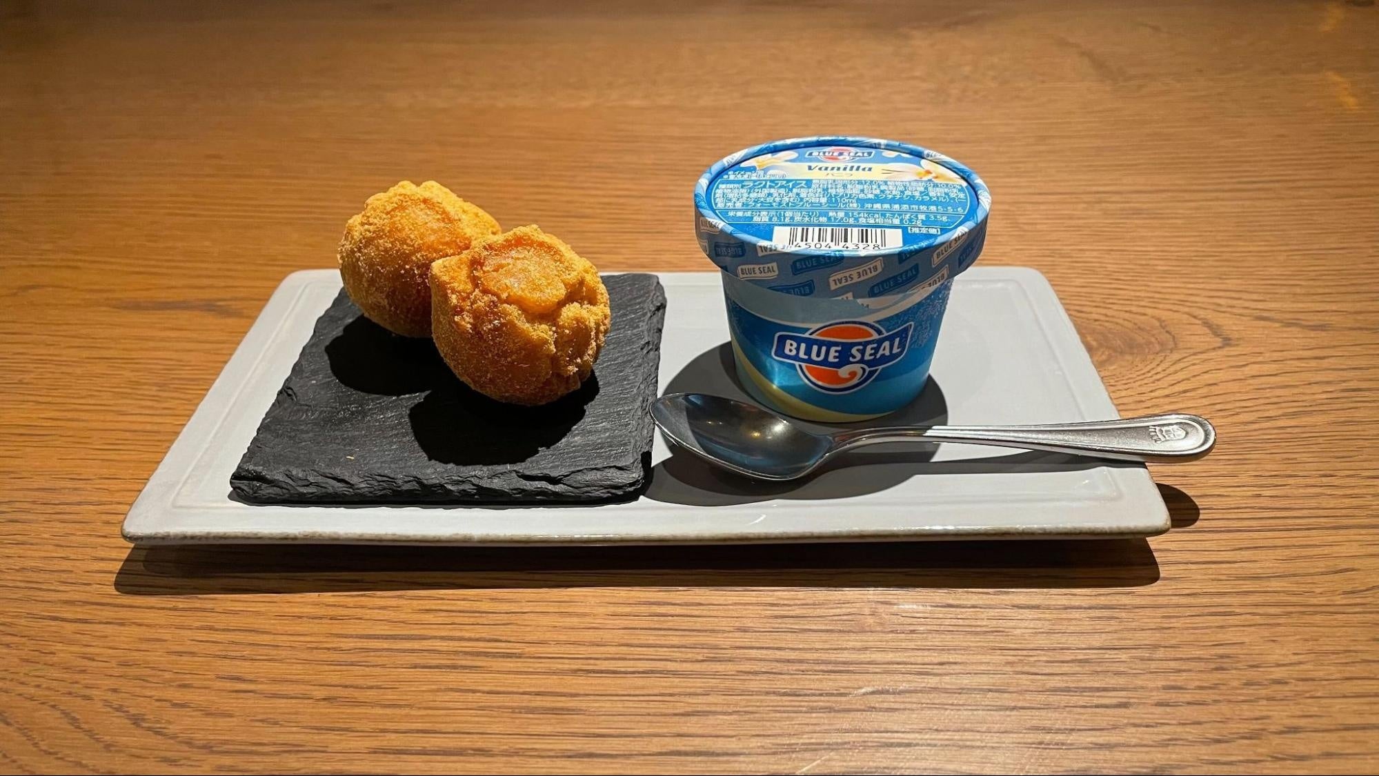 うま藻の醤油麹を混ぜた生地から作った特別なサーターアンダギー。「甘い×しょっぱい」の絶妙なバランスで、まるでみたらしのような味わいです。セットのアイスはメニューよりお好きなフレーバーをお選びいただけます。