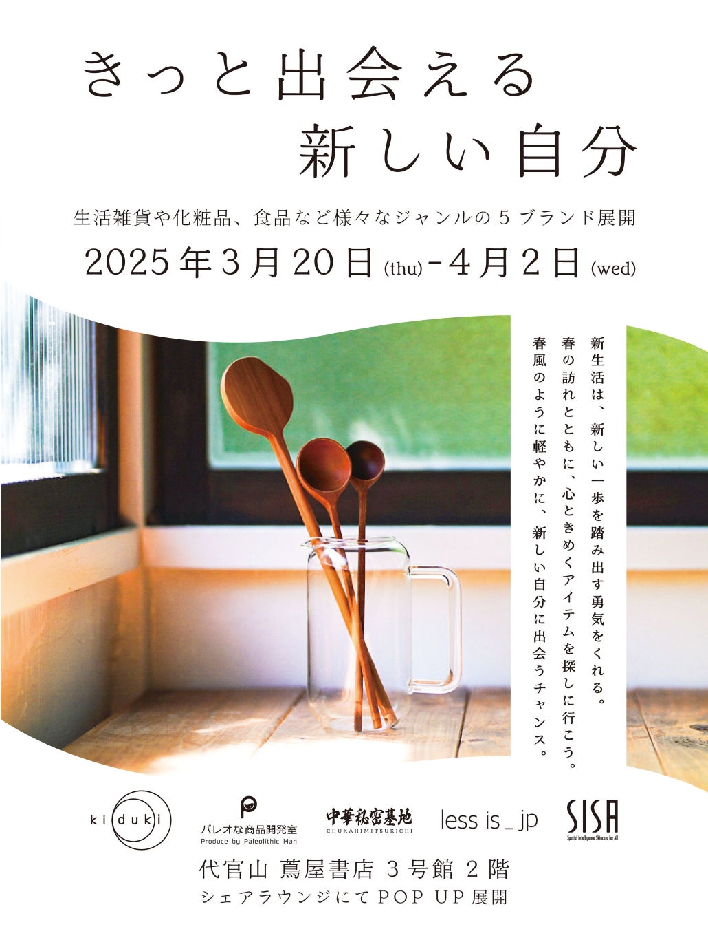 本フェアでは、「ki duki」「less is_jp」「パレオな商品開発室」「SISA」「中華秘密基地」の5つの人気ブランドが一堂に会し、新生活を彩る多彩なアイテムを展開します。各ブランドのインフルエンサーが培ってきた独自の視点と感性を活かした、他では手に入らない特別な商品との出会いを提供いたします。