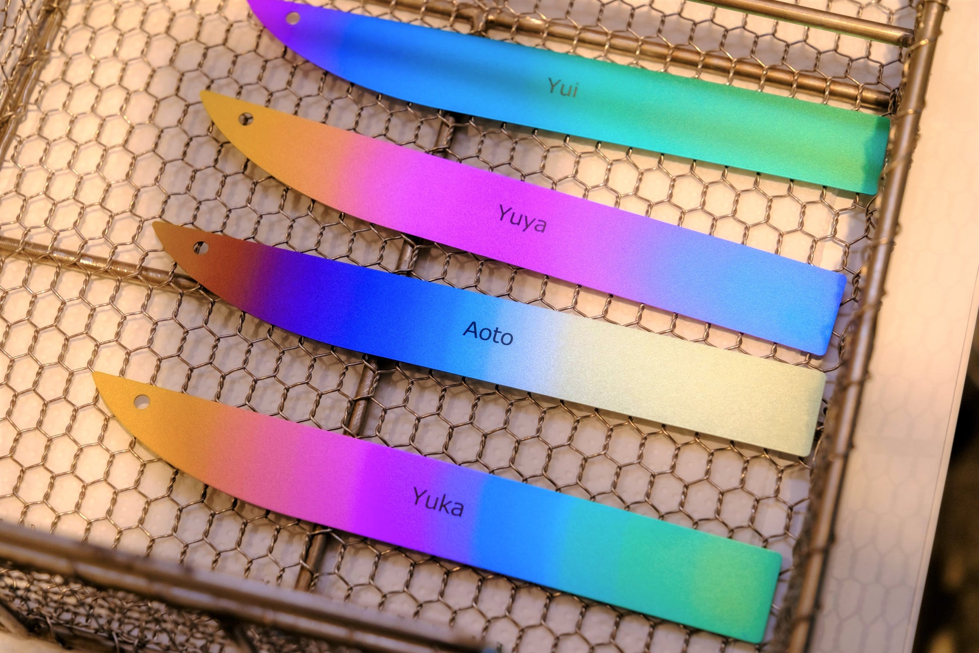 さらに、チタンの表面に特殊加工(チタン発色加工)を施すことで、チタンに鮮やかな色を付けることが可能です(干渉色:シャボン玉や虹と同様の発色原理)。表面のテクスチャー仕上げと組み合わせる事で、多彩な意匠表現を実現します。