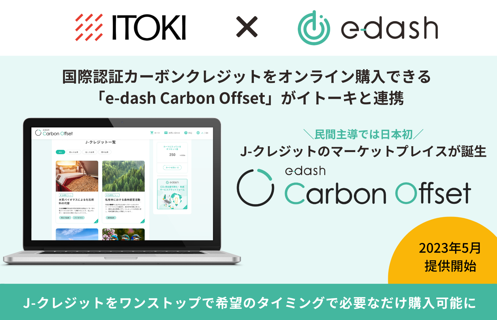 CO2排出量可視化のクラウドサービス「e-dash」を提供するe-dash株式会社(本社:東京都千代田区、代表取締役:山崎冬馬、読み:イーダッシュ、以下「当社」)は、J-クレジットプロバイダー大手の株式会社イトーキ(本社:東京都中央区、代表取締役社長:湊宏司、以下「イトーキ」)と連携し、当社が運営するカーボン・クレジットのマーケットプレイス「e-dash Carbon Offset」上で、J-クレジットの販売を今年5月より開始することを発表します。民間主導によるオンラインマーケットプレイスでのJクレジットの取り扱いは日本初(※1)の取り組みとなります。