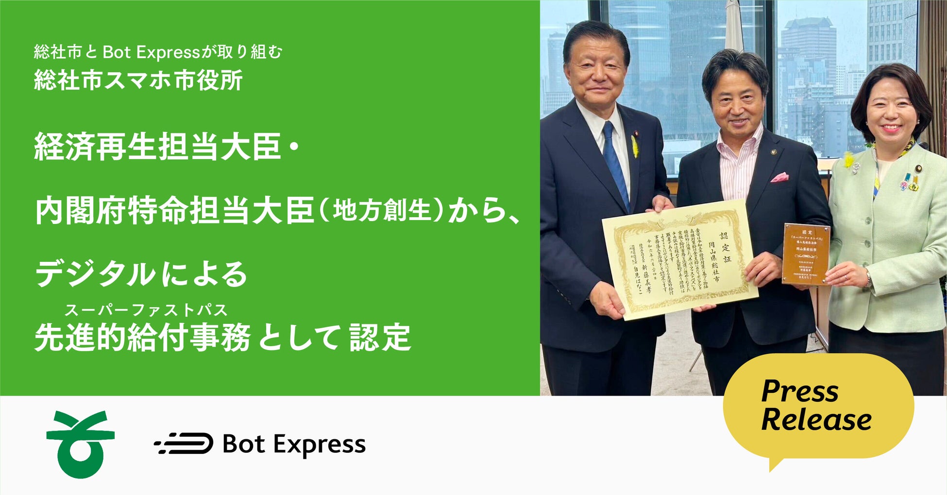 岡山県総社市(市長:片岡 聡一)と株式会社Bot Express(本社:東京都港区、代表取締役:中嶋 一樹、以下 Bot Express)は、総社市LINE公式アカウント上に開設された「総社市スマホ市役所」において実施した、PUSH型通知サービスによる給付金手続きについて、デジタルを積極的に活用し先駆的に「スーパーファストパス」を導入しました。この取組が評価され、迅速・簡素・適切に行った先進的な自治体として、新藤経済再生担当大臣、自見内閣府特命担当大臣(地方創生)より、岡山県総社市が6月24日付で認定を受けたことをお知らせいたします。
