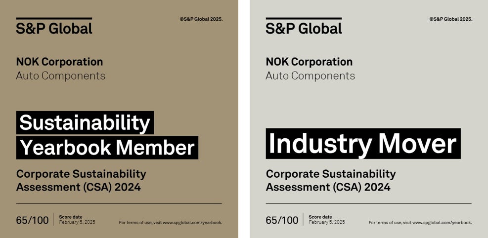 NOK株式会社(本社:東京都港区芝大門、代表取締役 社長執行役員 グループCEO:鶴 正雄、以下「NOK」)は、世界的な調査・評価機関であるS&P Global社が発行する「The Sustainability Yearbook 2025」において、業界の上位15%以内の評価スコアを獲得した企業として「Yearbook Member」に選定されました。また、自動車部品業界内で、前年より最も大幅な改善を達成した企業として「Industry Mover」にも同時に選定されました。NOKが「Yearbook Member」、「Industry Mover」に選定されるのは初めてです。