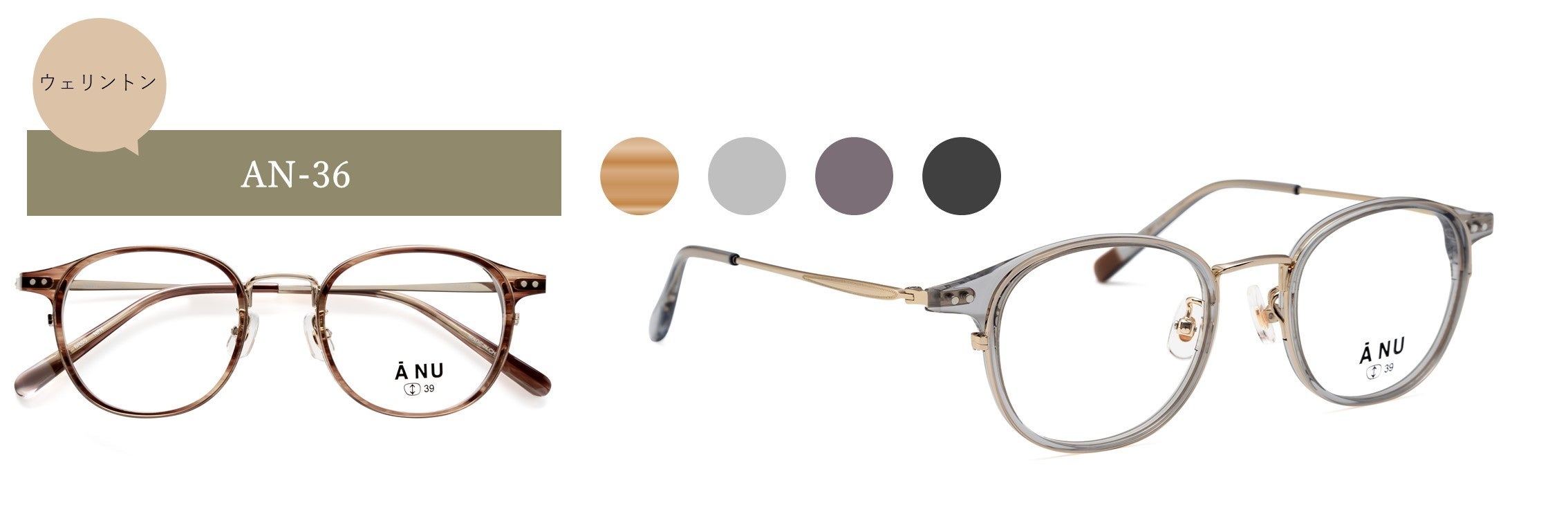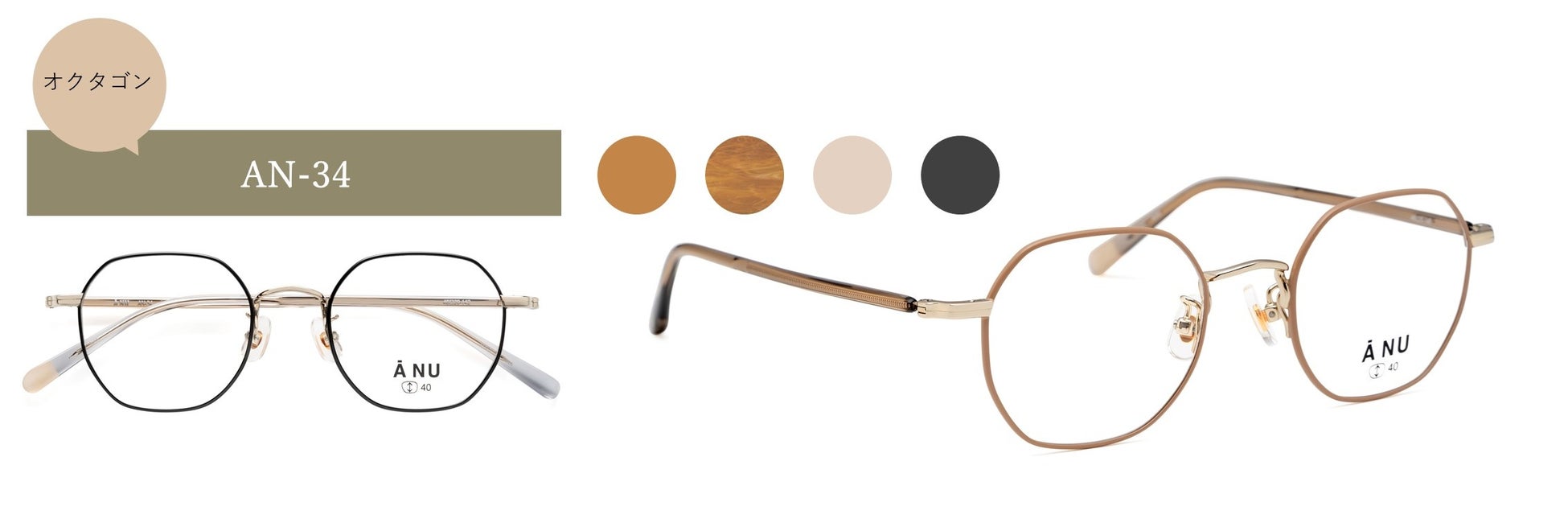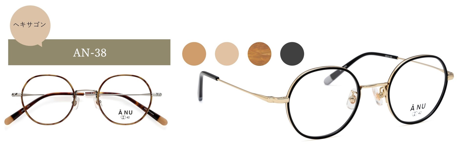 顔タイプ選ばず掛けることができるセル巻きのヘキサゴンシェイプ。コンビネーションフレーム(AN-36、AN-37)と近い印象がありますが、細身のすっきりとしたフロントデザインとカクカクした玉形のため知的な印象を与えます。カラーは、ライトブラウン、クリアブラウン、デミブラウン、ブラックの4色です。