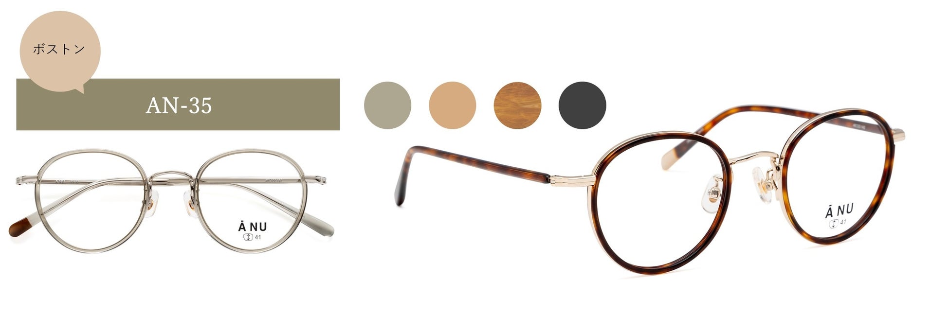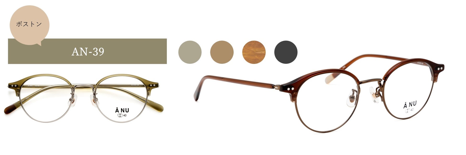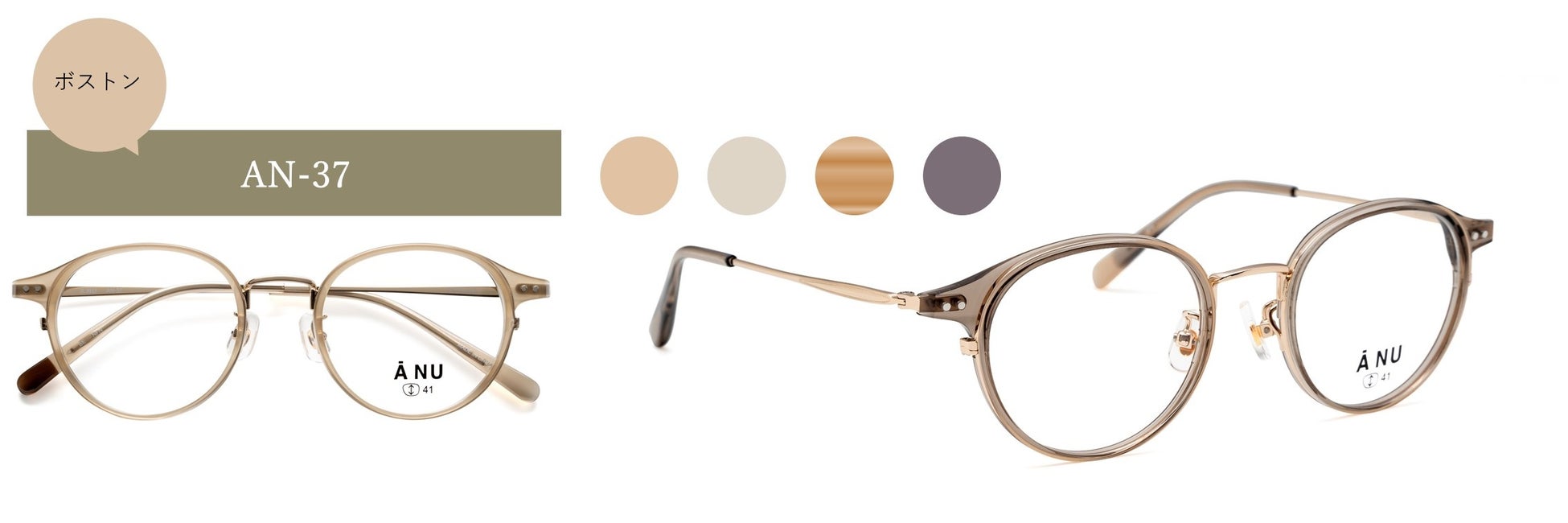 細部までこだわりが詰まった上質な印象のボストンシェイプ。AN-36と玉形違いのデザインです。丸みのあるシェイプで優しい印象を与えることができ、カジュアルシーンにも最適なデザインです。カラーは、クリアブラウン、ベージュ、ブラウンササ、チャコールの4色です。
