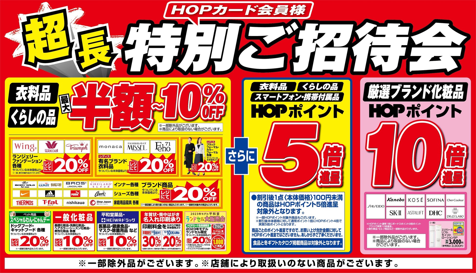 衣料品とくらしの品は、この7日間、最大半額から10%割引、また、均一価格やレジにて割引企画のほか、お買い上げ時のHOPポイント5倍進呈いたします。