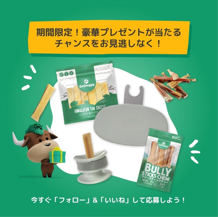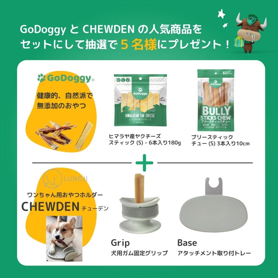 GoDoggyの愛犬用おやつとLUNOJIのガムスタンドとベースがセットになったCHEWDEN GRIP SETをセットにして、抽選で5名様にプレゼント!