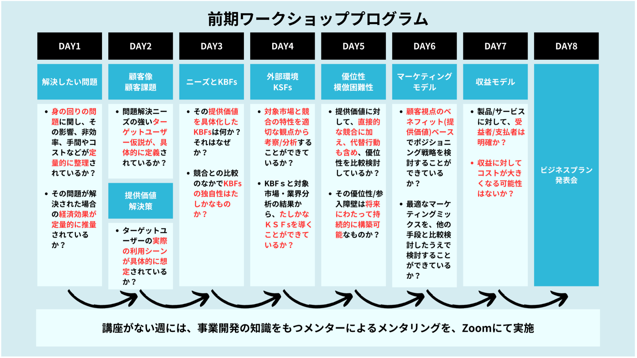 前期では、隔週で8回の講座(7回のワークショップ形式のレクチャー及び起業家との座談会、1回のビジネスプラン発表会)を開催し、高専生が関心を持つ課題から事業アイデアを策定します。講座がない週には、事業開発の知識をもつメンターによるメンタリングを同じく8回実施し、事業アイデアの精緻化を図ります。