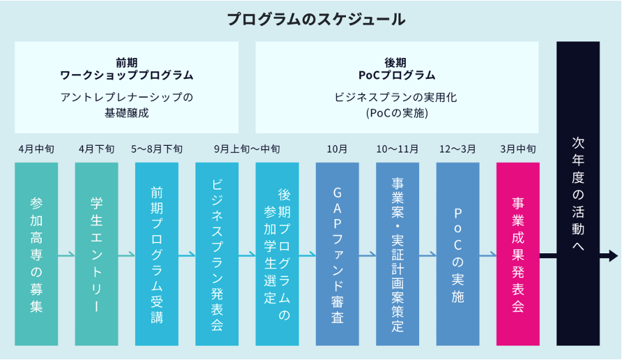 プログラムを通じて、高専生は事業化パートナーと共に顧客課題やニーズの発掘から事業計画の策定まで実施し、最終回である8回目の講座では、高専生が策定した事業アイデアを外部のVCや高専出身起業家に対して発表するビジネスプラン発表会を実施します。そのフィードバックを基に、後期プログラムPoCプログラムでの事業開発につなげる機会を提供します。