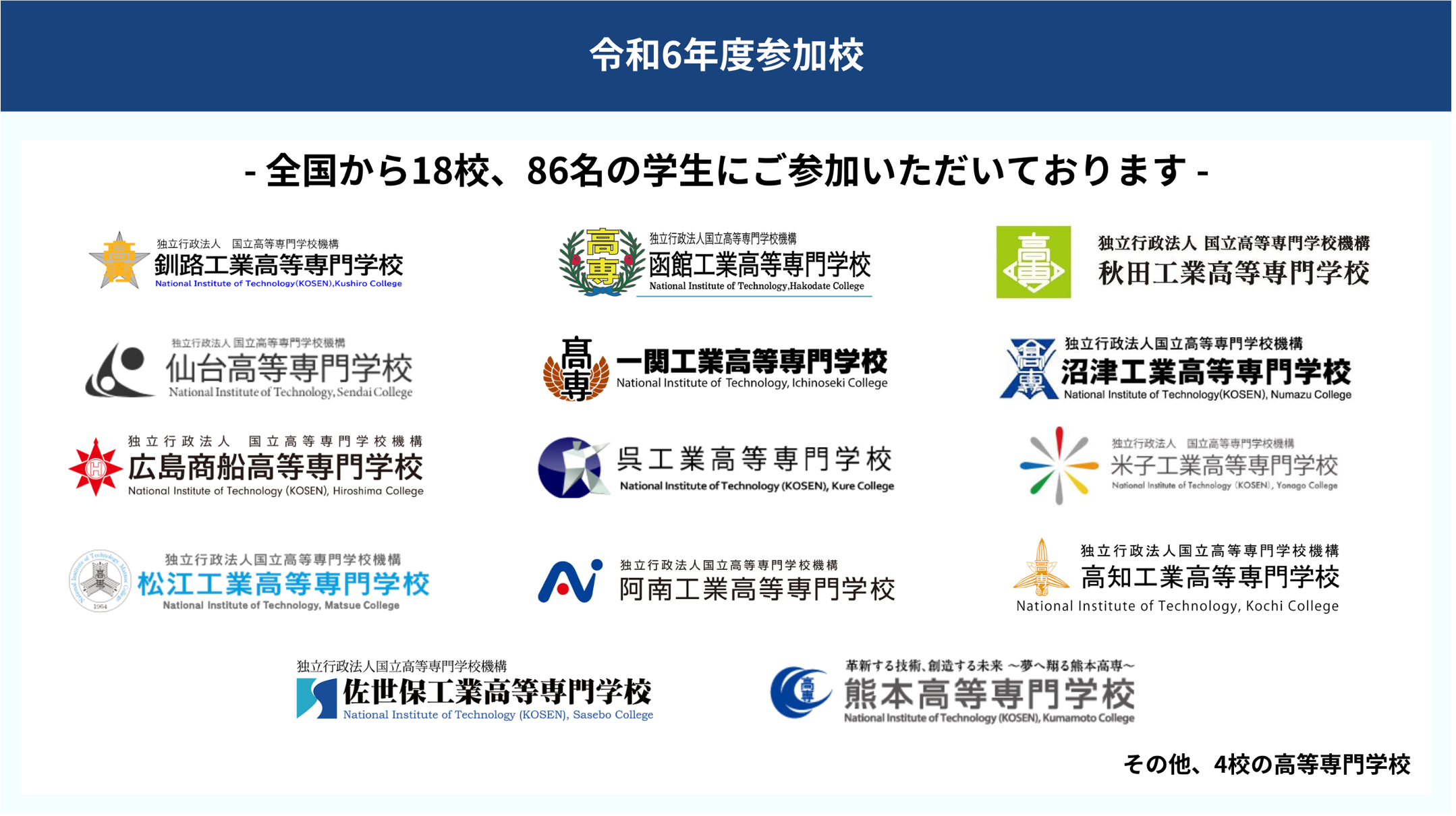 「KIC」は令和4年度に初めて開催されて以来、今年で3回目を迎え、昨年度より参加校が大幅に増加し、今年は全国から18校の高等専門学校、86名の学生が参加することが決定しました。