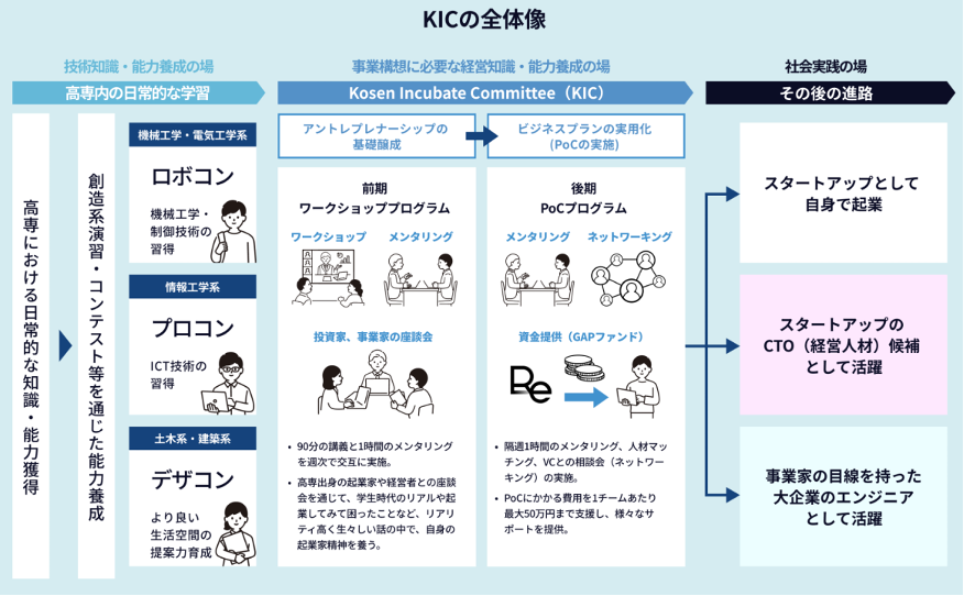 参加者は、事業者目線の経営知識・能力を養うために必要な思考回路を学ぶ講座、事業開発の知識をもつメンターによるメンタリング及びプロトタイプでのPoC実施の支援を受けることができます。自身の意向や状況に応じた伴走支援を受けながら、自身の関心ごとに基づき、研究内容や身の回り、地域の課題などを起点に事業アイデアの構築と実現に取り組みます。弊社はKICを通じて、起業家やスタートアップ、経営人財として重要なアントレプレナーシップを醸成し、全国の高専生のキャリア形成につなげていきます。