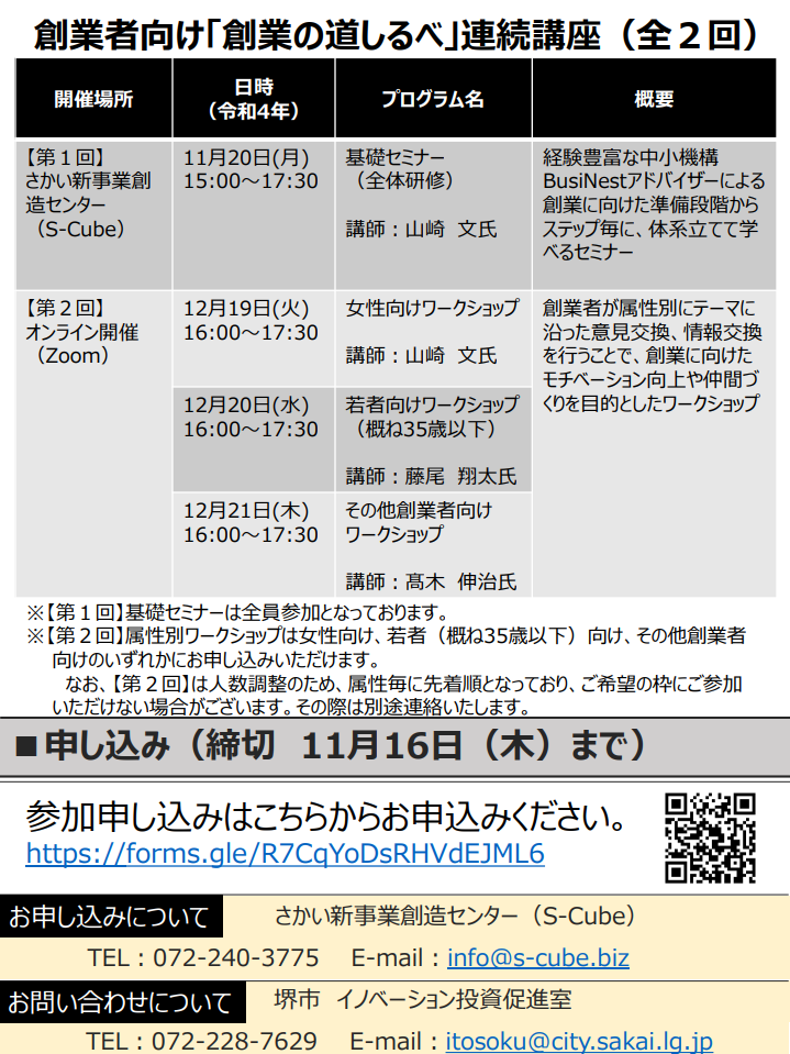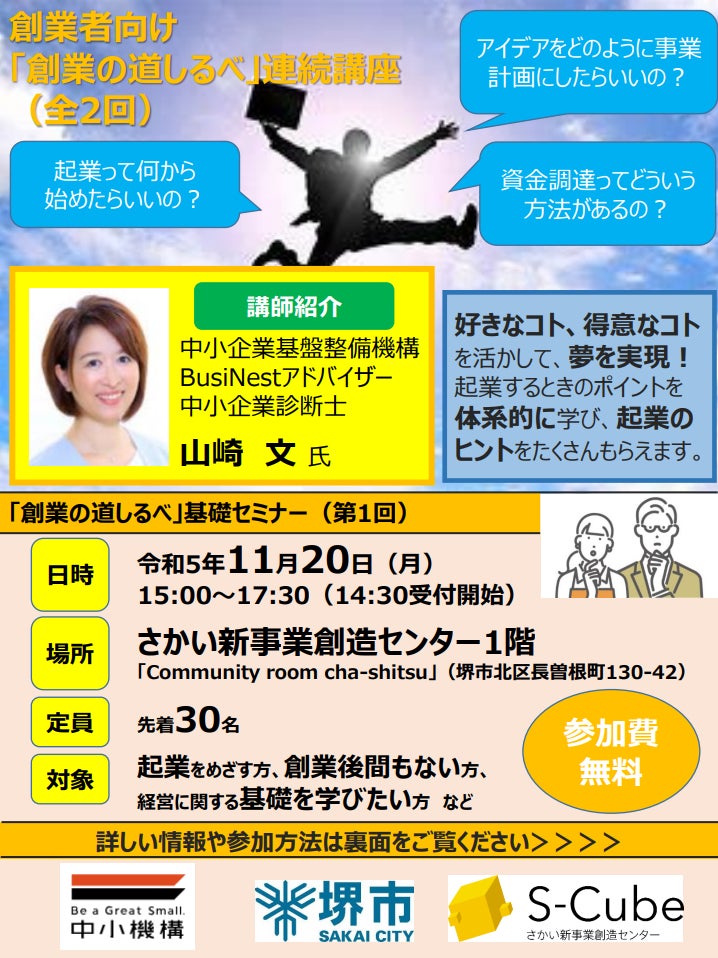 創業者向け「創業の道しるべ」連続講座(全2回)を堺市の新しい交流拠点で開催します。