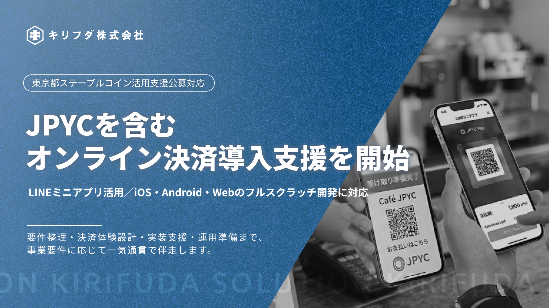 キリフダ株式会社(本社:東京都中央区、代表取締役社長:赤川英之)は、JPYCを含むオンライン決済の導入を支援する「オンライン決済導入支援パッケージ」(以下、本パッケージ)の提供を、2026年4月21日より開始します。東京都のステーブルコイン活用支援公募の開始を背景に、事業者の次世代決済導入における要件整理から決済フロー設計、実装支援、運用準備までを一貫して支援します。キリフダが保有するLINEミニアプリ(LIFF)向けのウォレット作成・実装基盤を活用した短期導入に加え、LINE以外(iOS/Androidネイティブアプリ、Webアプリ)でのフルスクラッチ開発にも対応します。