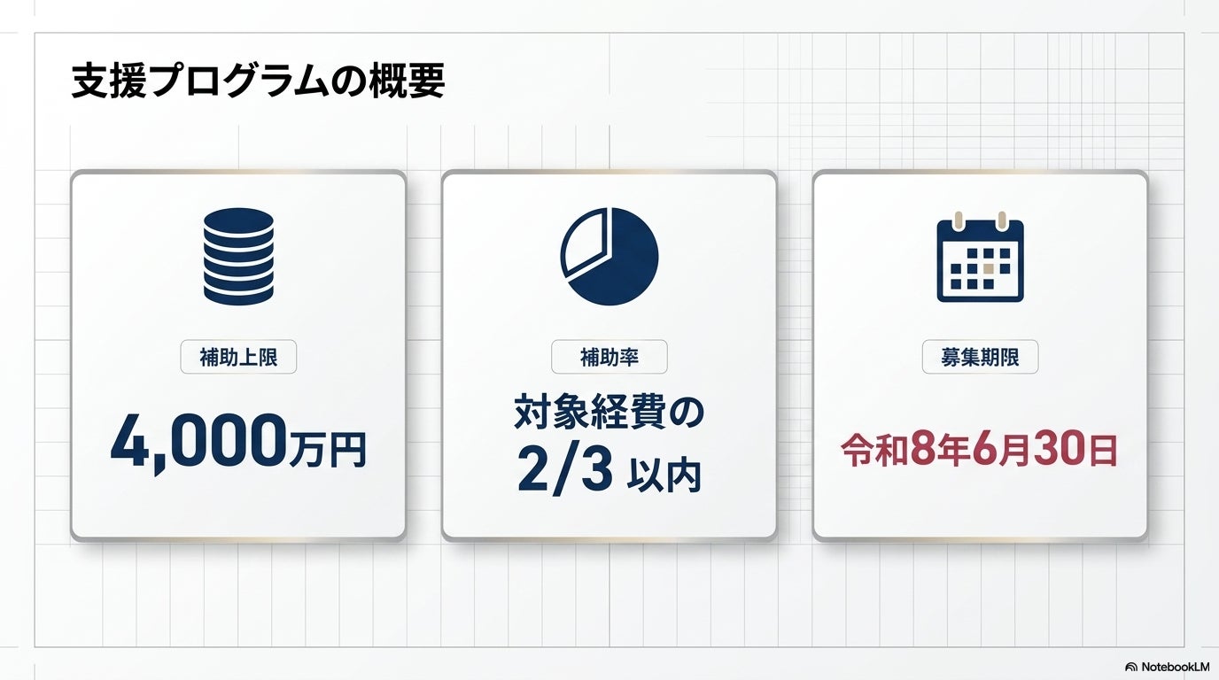 公募期間は2026年4月17日(金)から6月30日(火)まで、補助率は対象経費の3分の2以内、補助上限額は1件あたり4,000万円です。補助対象経費は、外部基盤利用経費、専門家への相談・監査等に係る経費、システム開発経費です。