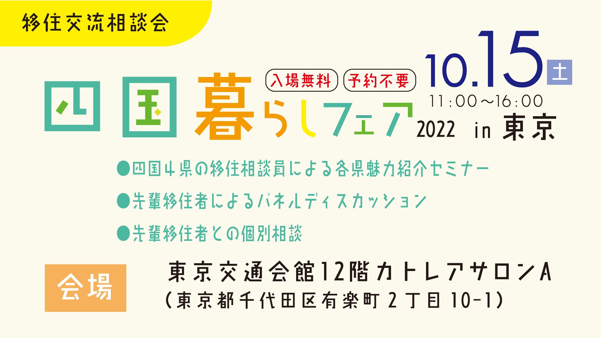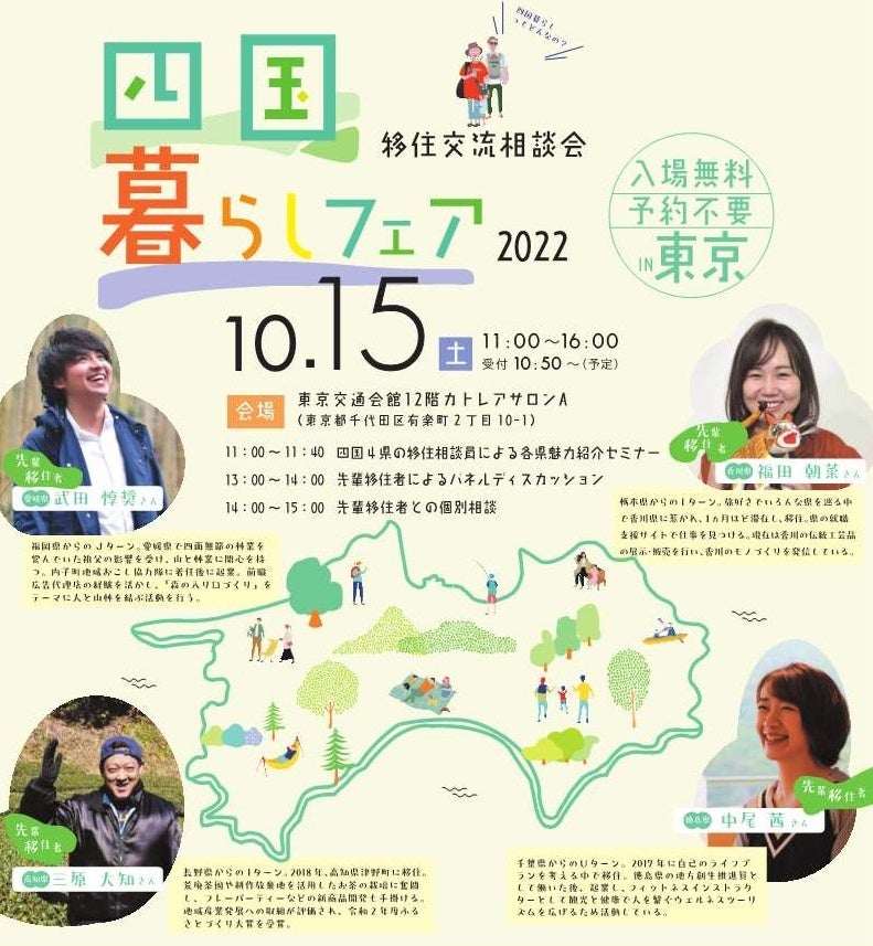 当日は四国各県の魅力紹介、先輩移住者を招いての移住体験談セミナーのほか、各県の移住相談員による相談ブースもございます。