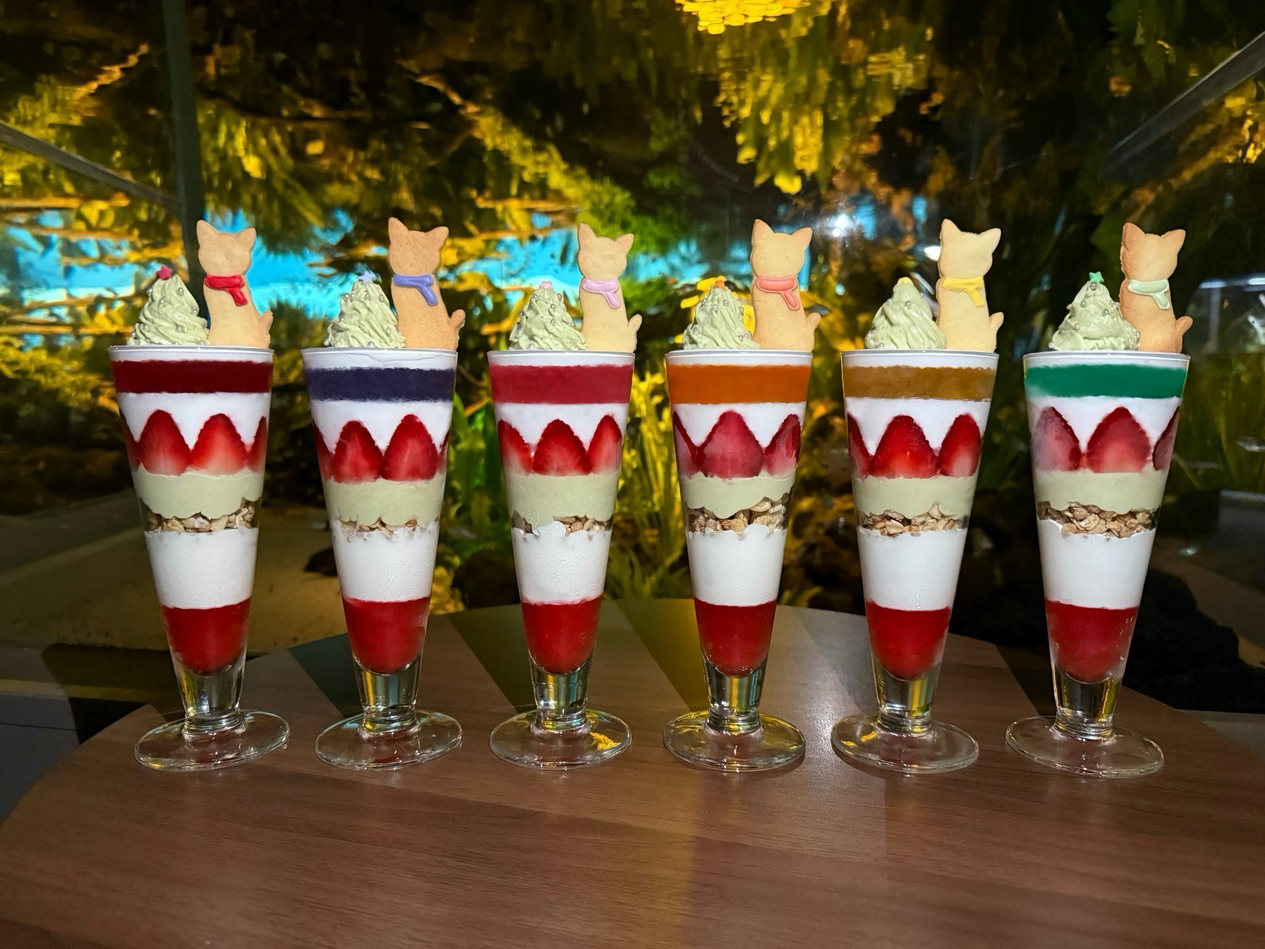 自家製のいちごジャムやピスタチオクリームを贅沢に使用したパフェに、カラーが異なるクラッシュゼリーとネコクッキーをあしらった一品。
