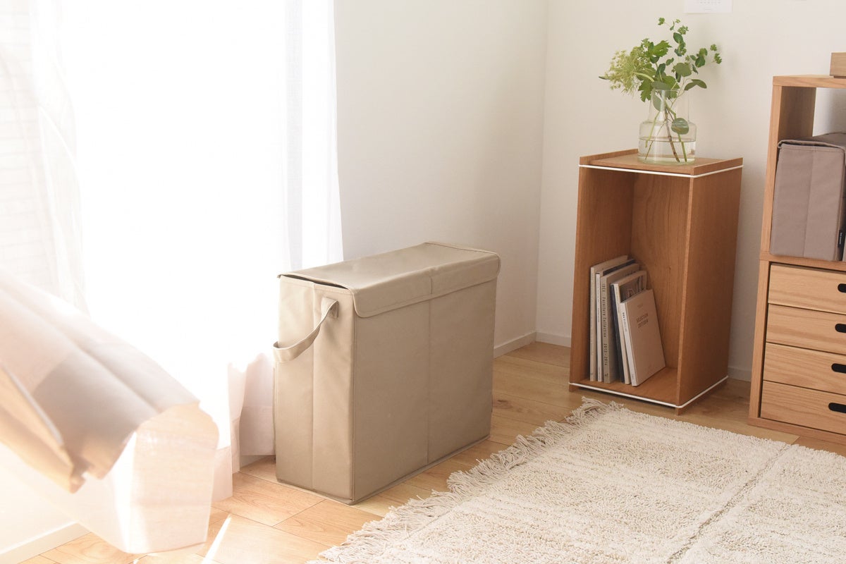 表の素材はシンプルで落ち着いたカラーの、しっかりとしたキャンバス風生地。洗濯機横やバルコニーの出入り口に置いても、インテリアに馴染んでくれるデザインです。