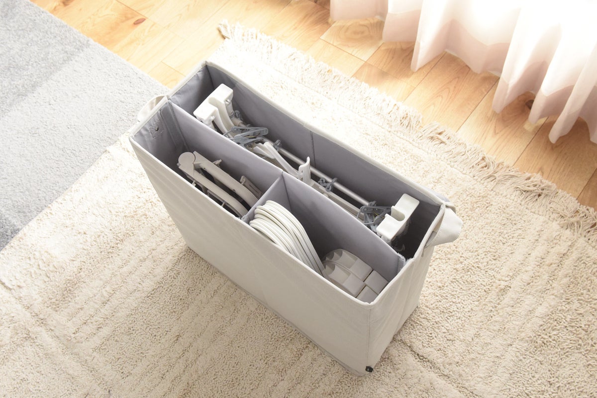 内側に仕切りがあることで、絡まりやすいハンガーも、きれいに並べて収納できます。また、かさばるピンチハンガーや、小さくてバラバラ散らばりやすい洗濯ばさみも、サイズごとに分けて収納OK。
