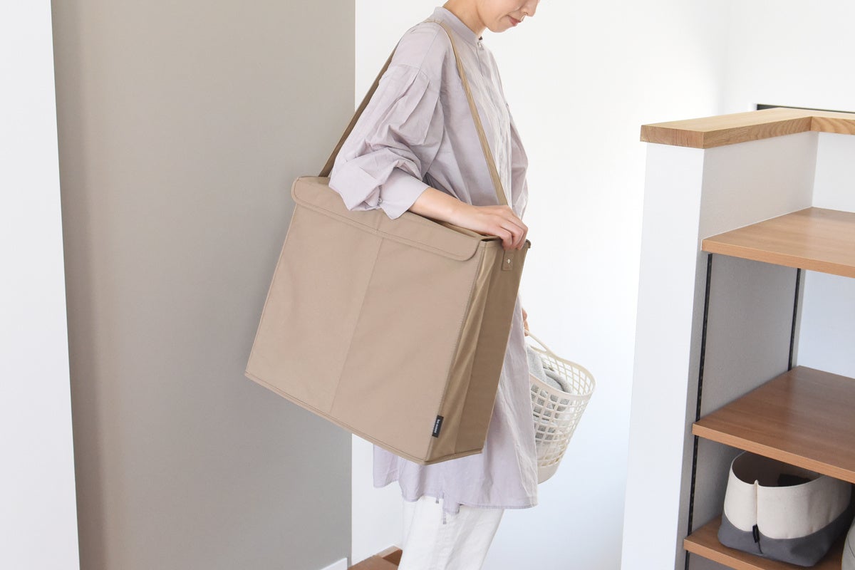 長めの持ち手はショルダーバッグのように肩掛けでき、手が空くので洗濯かごを両手でしっかり持つことも可能です。