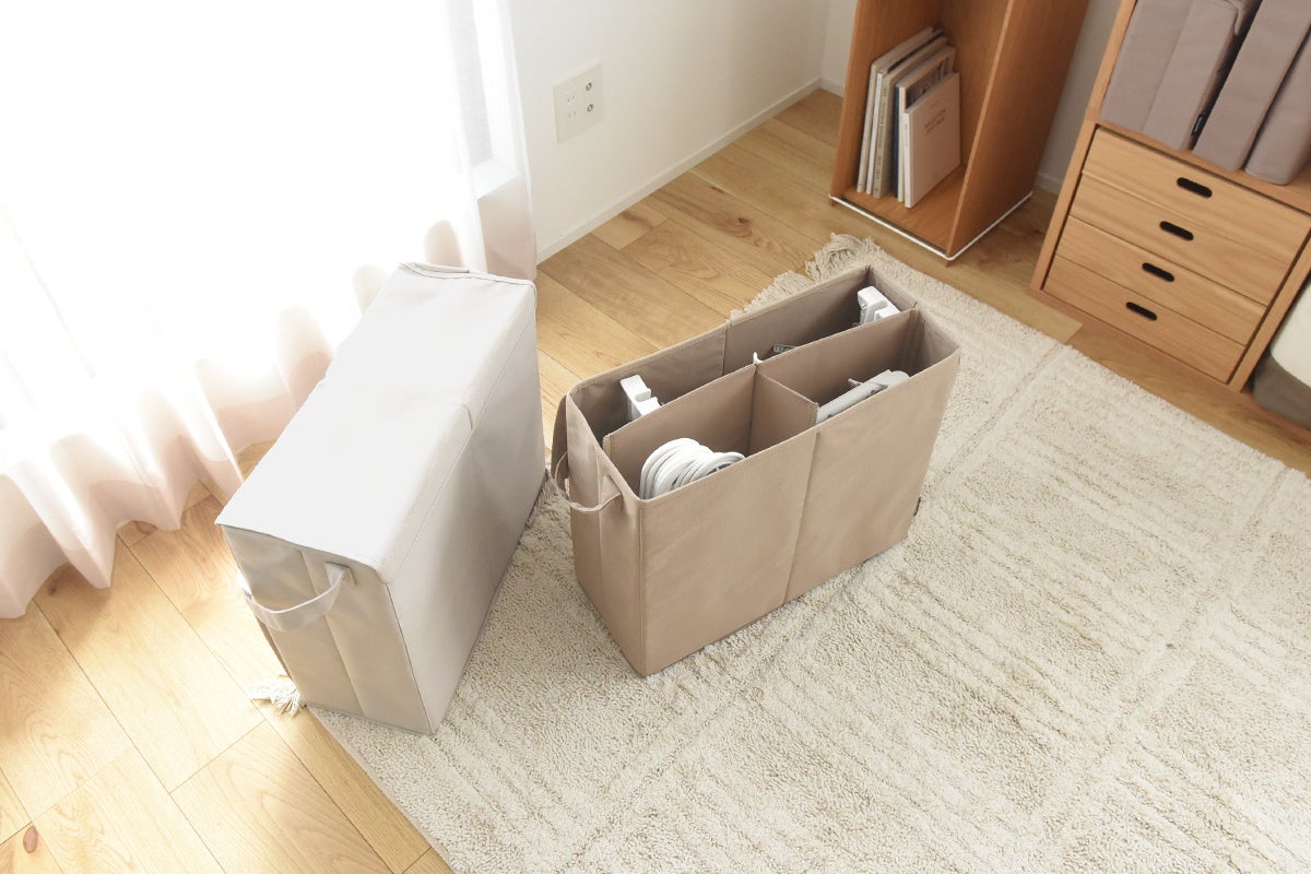 収納ボックスの蓋はピタッと閉じられて、開け閉めもラクなマグネット付き。中身を目隠しできて、生活感なく置けるだけでなく、中にホコリが溜まるのも防げます。