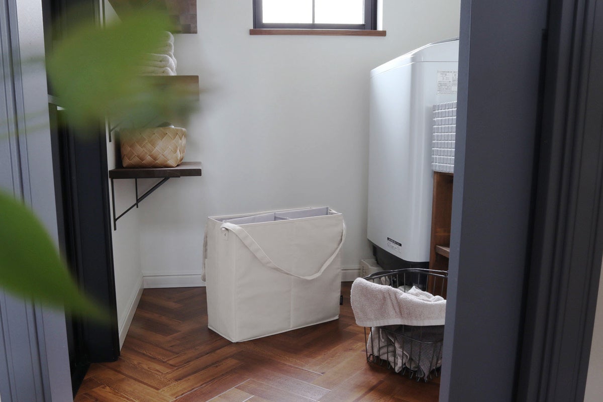 室内干しをしたりバルコニーで干したりと、日によって使う場所も変わるランドリーグッズを、サッと持ち運べる持ち手つきデザインにしています。
