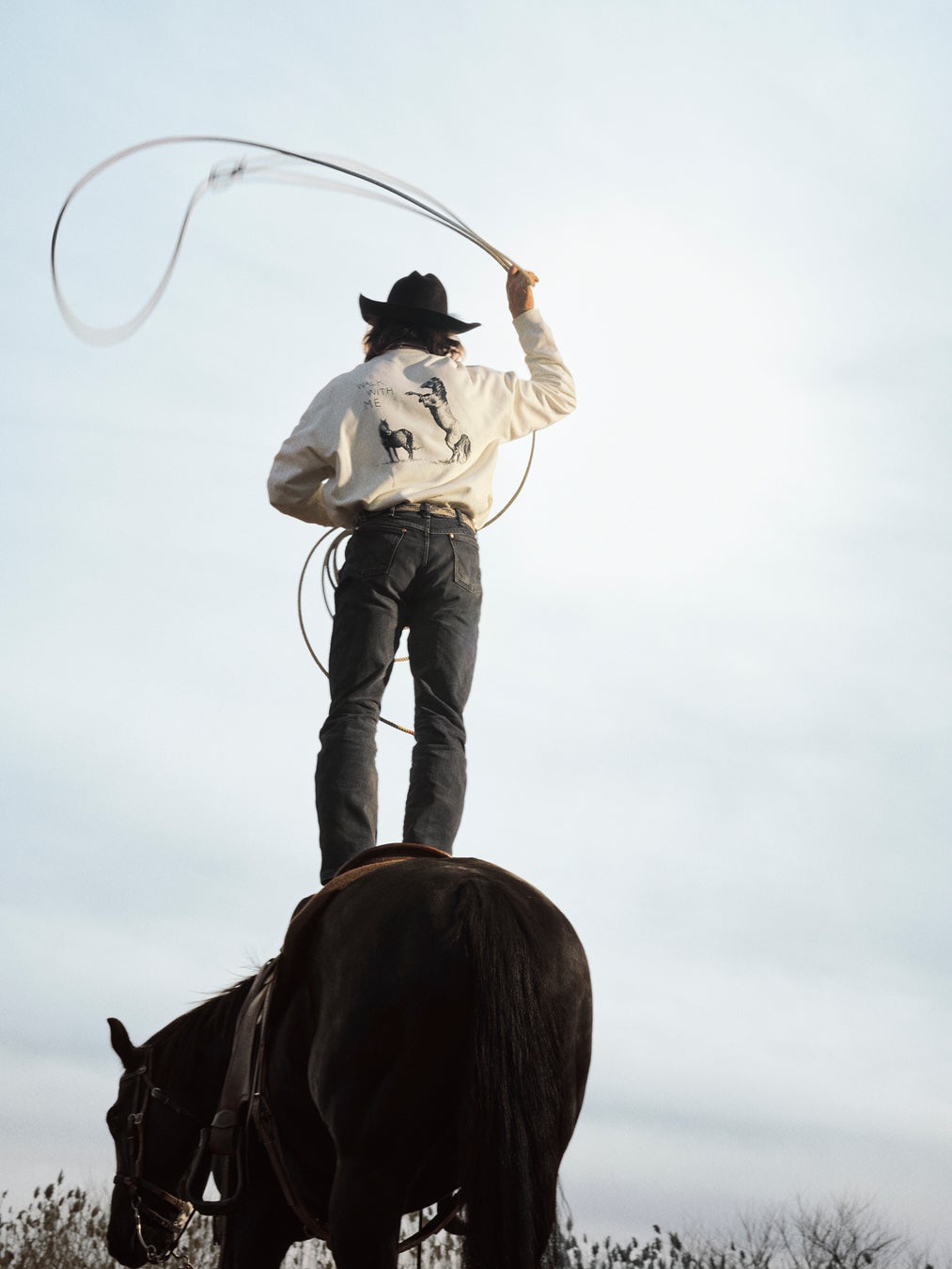 自然や野生馬を想起させるモチーフをさりげなく取り入れた彼の表現は、洗練されたビジュアルアプローチによって、ルナニューイヤーコレクションに文化的かつ芸術的な奥行きをもたらします。馬のフォルムやラインから着想を得たグラフィックは、ミニマルな構成の中に祝祭的な意味を宿し、コレクション全体のファッションストーリーと有機的に響き合います。