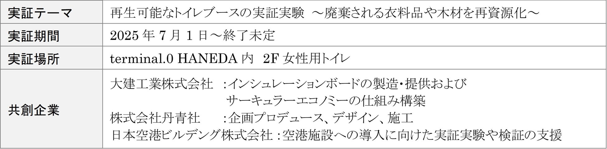 大建工業株式会社(大阪市北区、社長:億田正則)は、この度、非住宅分野での活動領域の拡大を目的に、日本空港ビルデング株式会社(東京都大田区、社長:田中一仁)が運営する、羽田空港の課題解決に異業種連携で取り組む研究開発拠点「terminal.0 HANEDA」(以下、terminal.0)に参画し、7月1日よりサーキュラーエコノミー(循環型経済)に関する実証実験を開始しましたのでお知らせします。