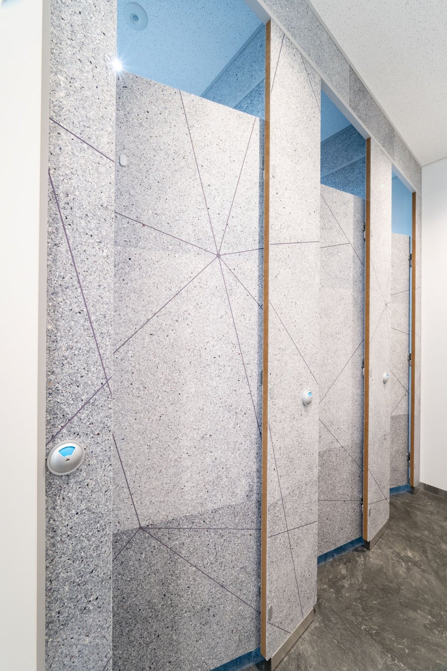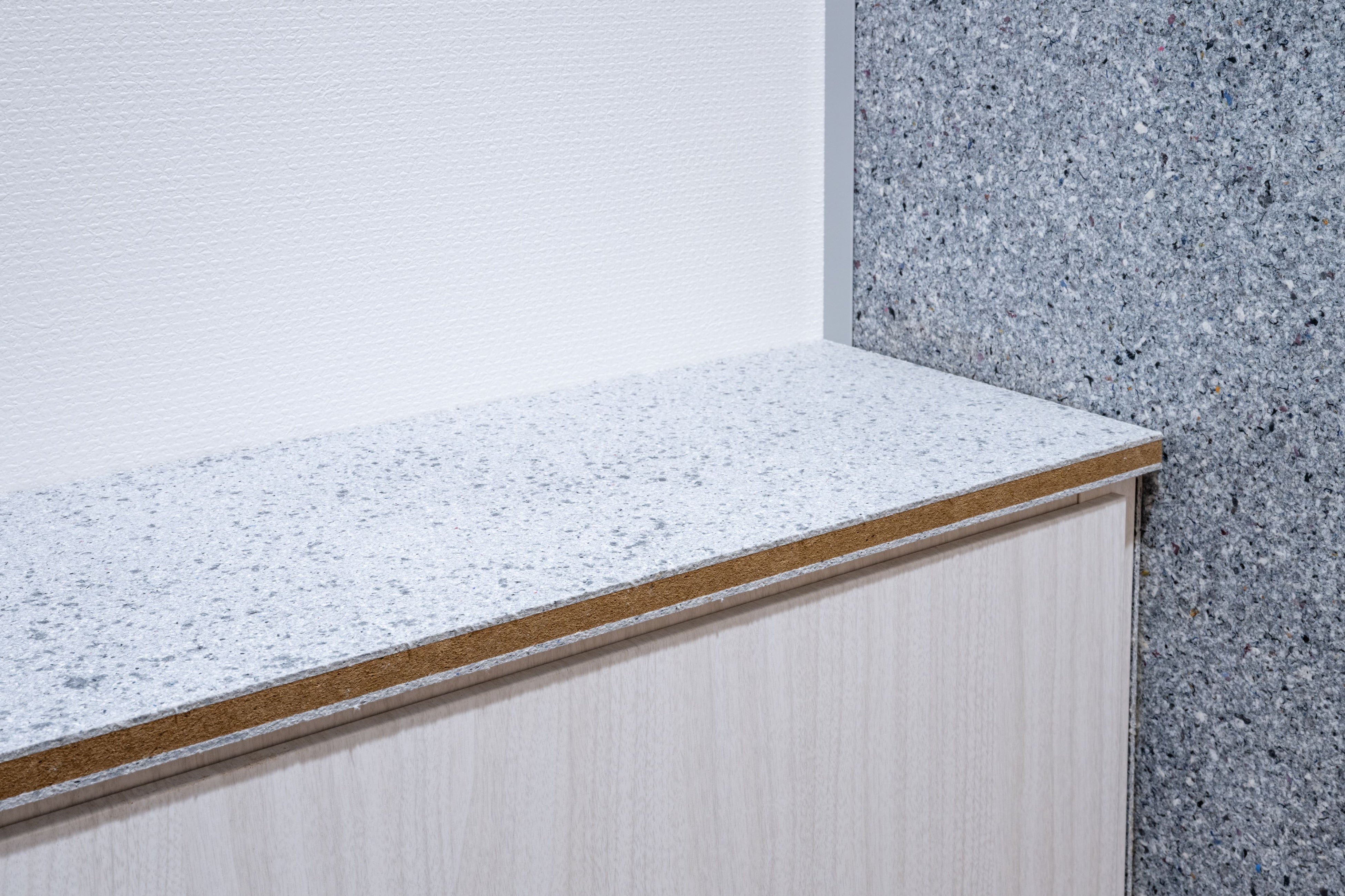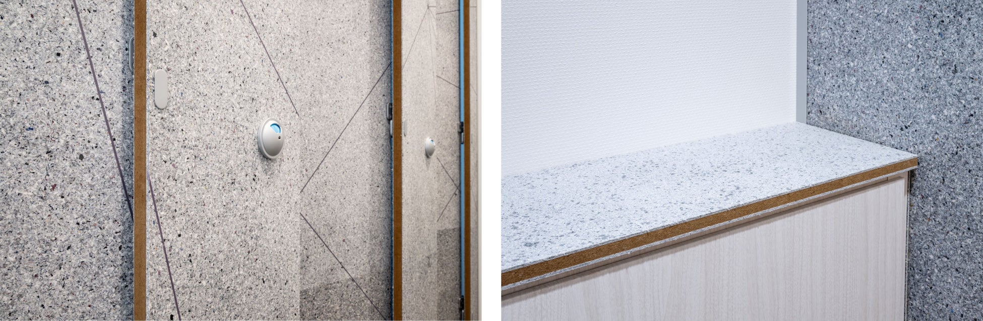 今回の実証実験では、廃棄衣類繊維を原料とした株式会社ワークスタジオの繊維リサイクルボード「PANECO®」と、建築廃材を再資源化した当社の「インシュレーションボード」を組み合わせたサステナブルなボードを制作し、「terminal.0」内のトイレブースの扉や壁・カウンターとして施工したほか、トイレブース内には、資源循環のメッセージを掲示することで、利用者に気づきを促し、サステナビリティへの意識醸成を図ります。なお、施工したボードを使用後に粉砕・形成することで、新たなボードとして再利用する検証も予定しています。