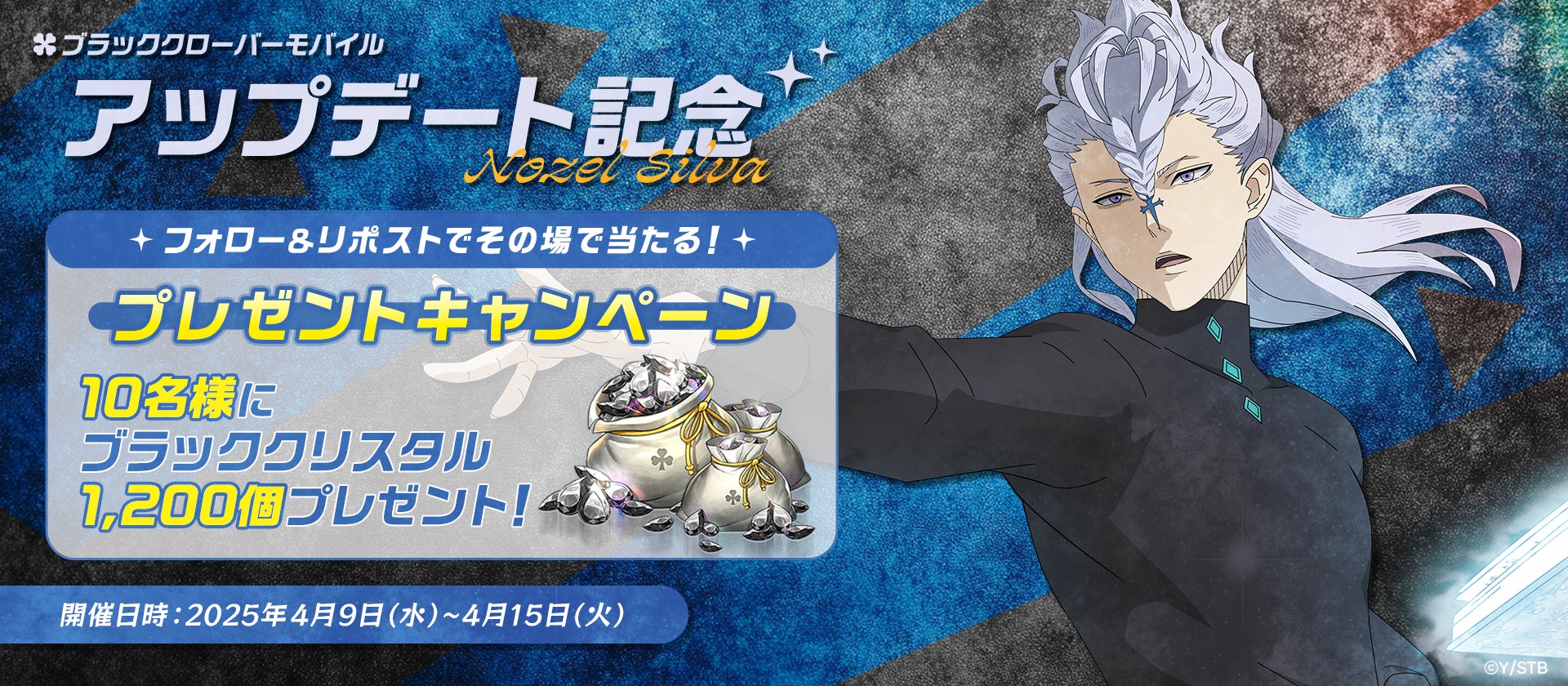 株式会社VIC GAME STUDIOS JAPAN(東京都新宿区、代表取締役:李 同校)は、テレビアニメ『ブラッククローバー』のアプリゲーム『ブラッククローバーモバイル 魔法帝への道 The Opening of Fate』(以下、ブラクロモ)において、本日4月9日(水)よりSSR魔道士「《銀色の執行者》ノゼル」と魔道士スキルページ「最強の天敵」が新登場したことをお知らせいたします。