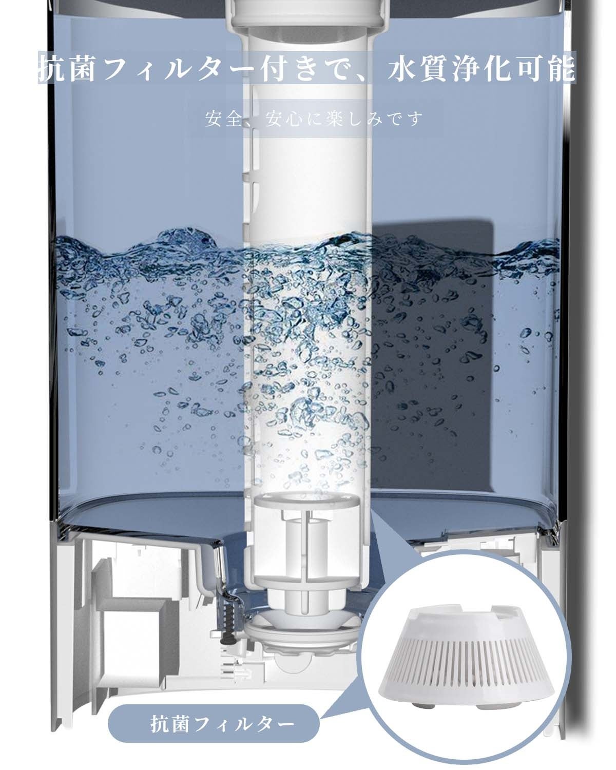 【3段階ミスト量の超音波式&次亜塩素酸水対応】超音波式でミストが熱くならないので、子供やペットがいるご家族も安心して使えます。タッチ操作で、ミスト量は弱・中・強の3段階で調節可能で、部屋の大きさや季節などに応じて選択できます。一方では本製品は次亜塩素酸水対応で除菌一酸化炭素、細菌など有害物質を抑制し、空気を綺麗になります。適切な湿度を保つことは、周りの空気を改善し、花粉症、乾燥などの不快感を緩和し、ウイルス対策にも効果的です。いつでも快適に過ごせる、ゆったりとした室内環境を作ります。