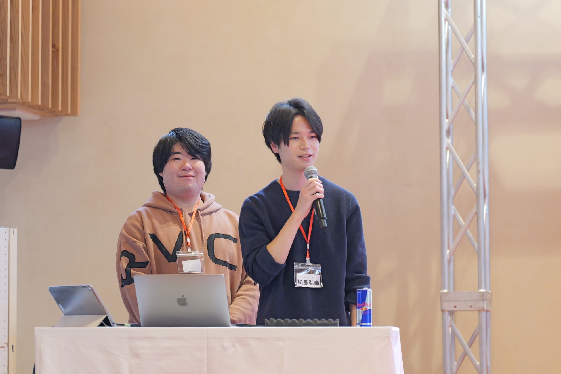 福島県からは「会津大学」に加え、今年度より新た「福島大学」が加わり、福島県勢として合計5名の学生が参加。会津大学の佐藤 丞(さとう しょう)さん【同校4年生/宮城県登米市出身/23歳※写真左】と東京大学の松島 弘幸(まつしま ひろゆき)さん【同大学院1年生/静岡県静岡市出身/25歳※写真右】のペアは、「エッジデバイスによるAIカメラを用いた工場の自立制御やクマ監視に対する課題解決」をテーマに発表。