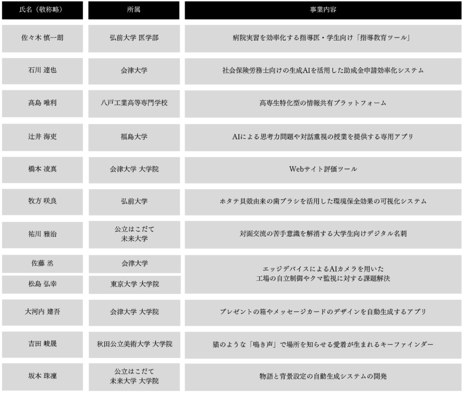 「アオタケプロジェクト (※1)」は、福島県と秋田県でスタートアップを目指す若手人材の発掘と支援を行うプロジェクトとして、2023年9月に始動。同エリアで起業を目指す学生を対象に、創業初期の支援、事業の展開フェーズごとの適切な環境、人員の確保、ネットワーク形成などのサポートを行って参りました。プロジェクト二年目を迎えた昨年度は、福島、秋田県に加え青森県の学生が参画。そして、今年度は東北を飛び越え、北海道エリアの 学生も支援対象とし拡大。総勢12名の高専生・大学生がアオタケプロジェクトを通じ、起業を目指し活動を行なってきました。