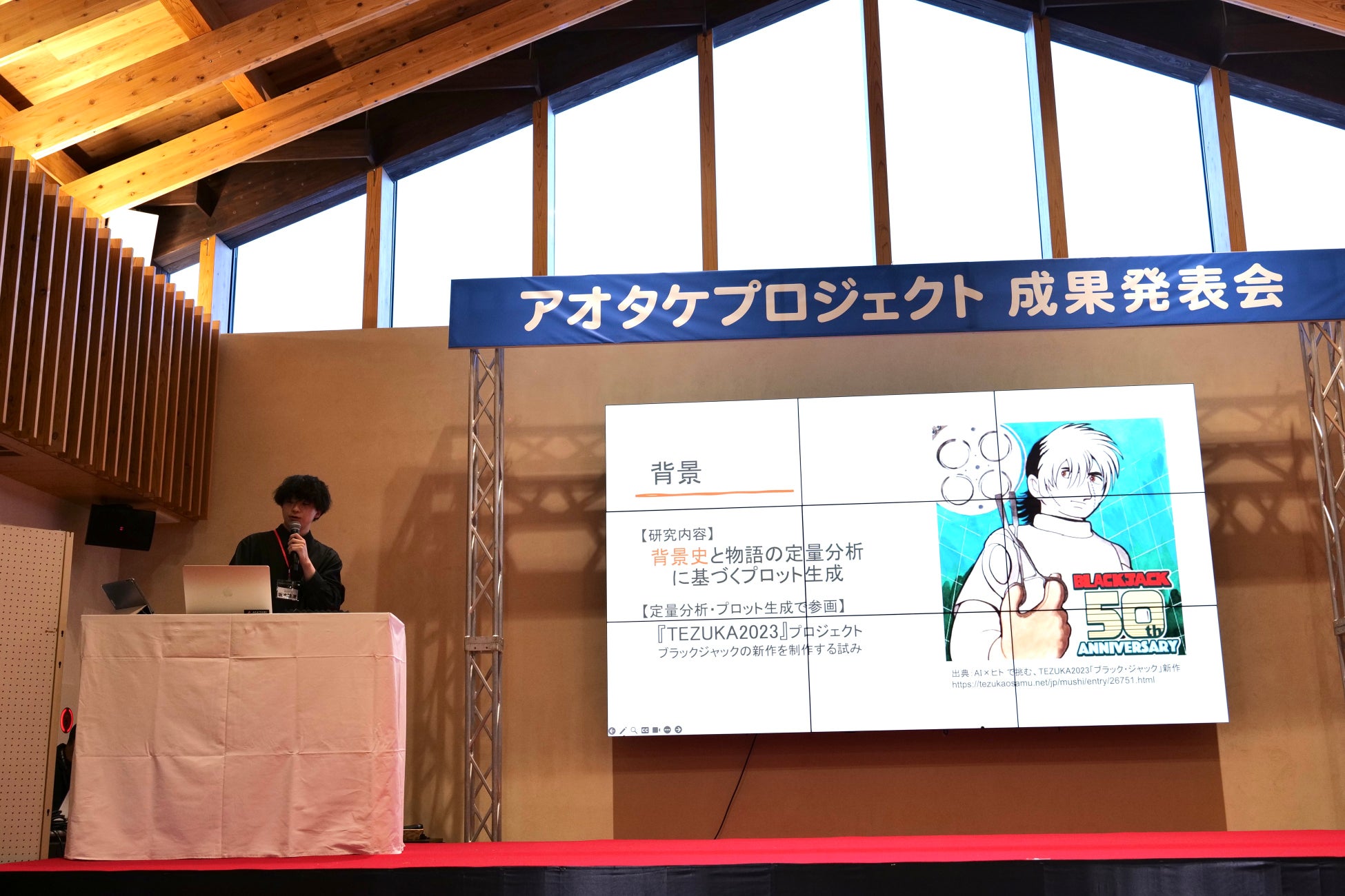 発表を終えた坂本さんにアオタケプロジェクトに参加した上での感想を問うと 、『非常に楽しい期間でした。ビジネスの計画を練るにあたり、何から手をつけていけばいいか分からなく八方塞がりの状態でしたが、メンターさんをはじめ、様々な方からのご支援を受けながら今日という日を迎えることができました。サポートを受けながらではございましたが、自身としてもここまで推進でき成長することができたと実感しております。』とコメント。また、今後の目標・展望については『AIの進化が目覚ましい昨今において、“AIに代替できることは何か”、“人にしかできないことは何か”、という問いにずっと向き合ってきました。物語制作のシーンでは徐々にAIの領域になりつつありますが、全てがAIに代替されるわけでもないと考えています。物語をどのように語れば、人間の情緒に突き動かすのかといった“暗黙知”はまだ明らかになっていません。それをまず知るところから、AIとの共創を見つめようとプロジェクトを進めてきました。今後もそれを継続しつつ、社会に対して、AIと人の物語の共創の形を提示していくべく、ビジネス化に向け頑張っていきたいと思います。』と力強く意気込みを語られました。