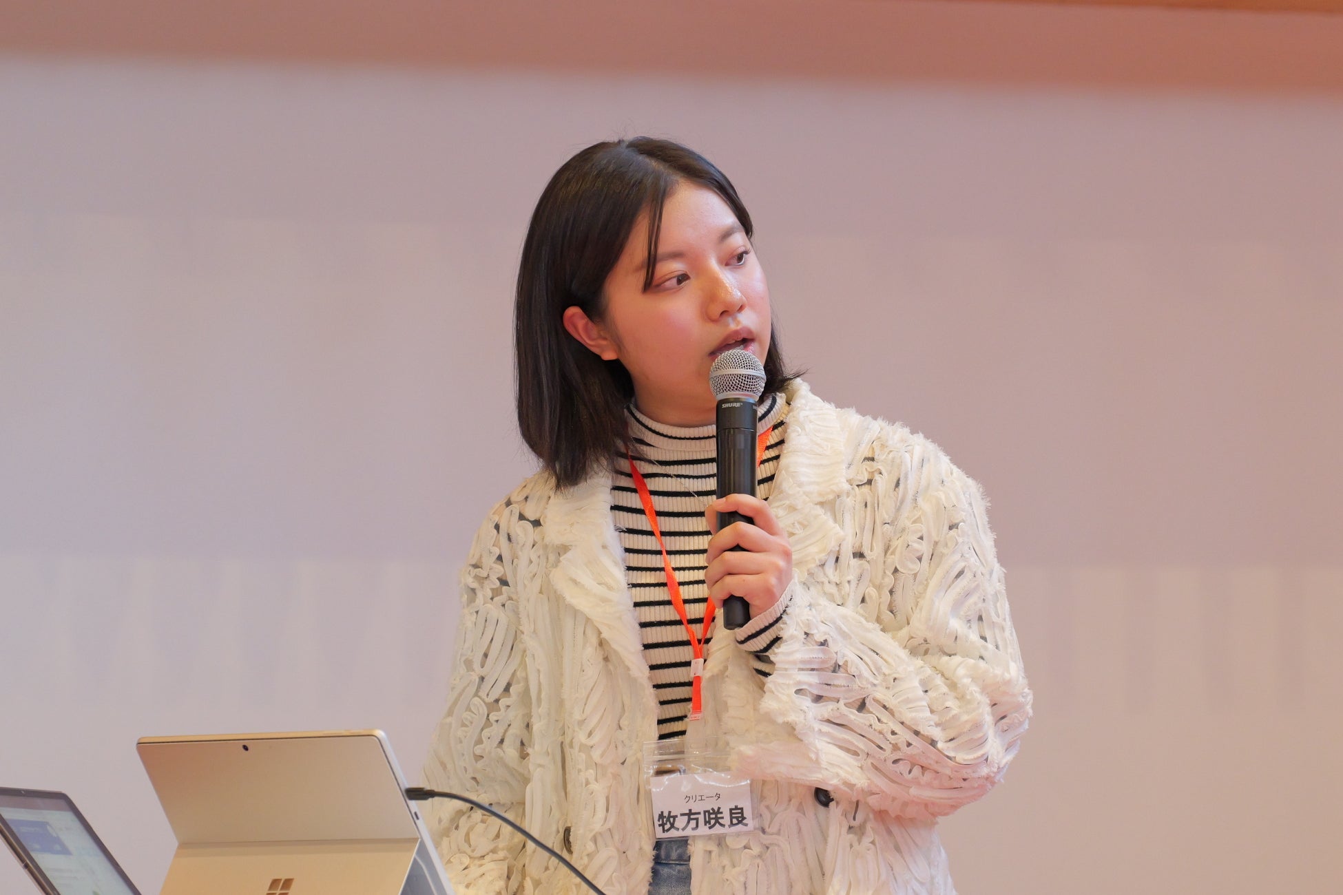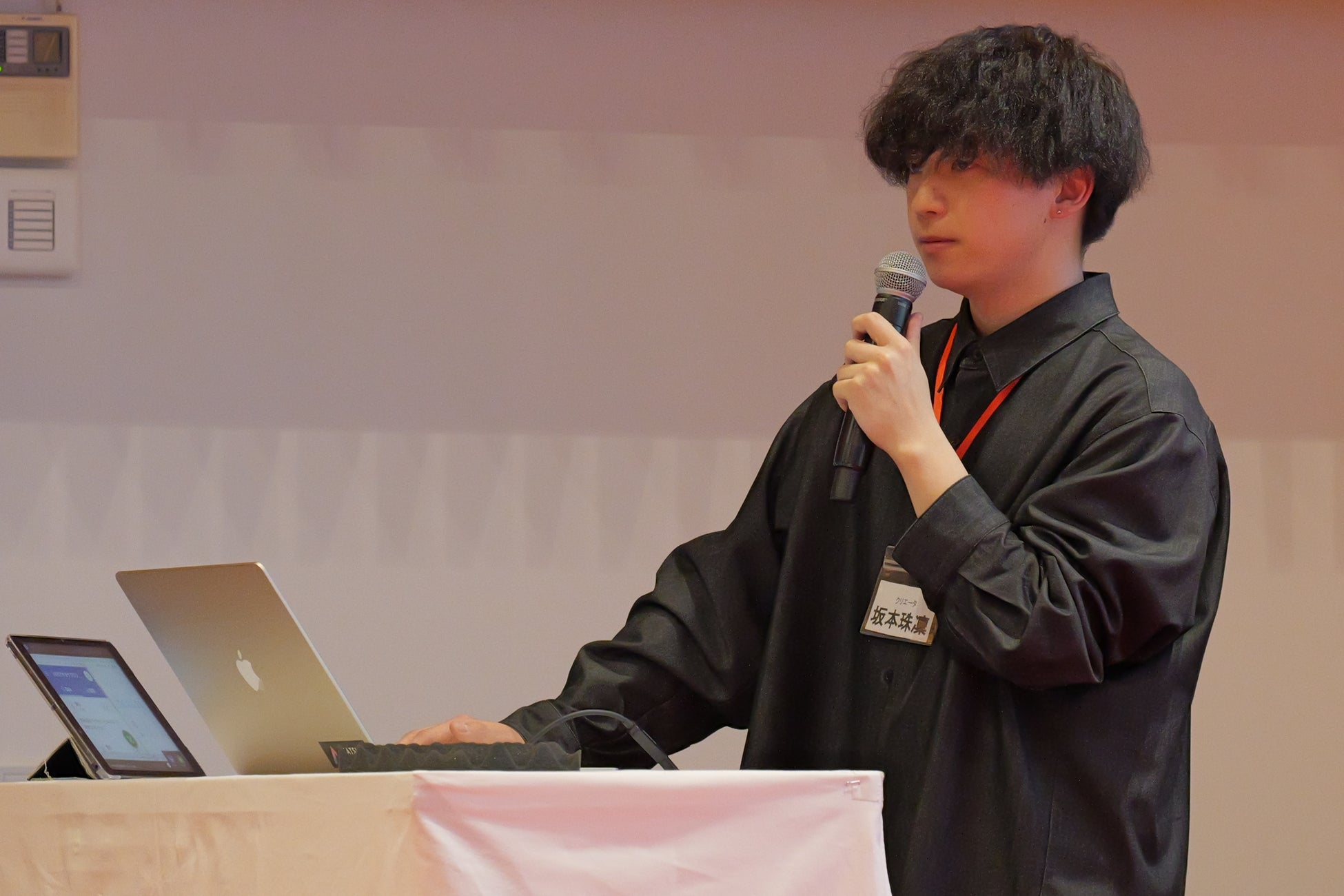 今年度より新たに本プロジェクトに参画することになった北海道からは、公立はこだて未来大学より2名の学生が参加。今回の成果発表会で最終プレゼンターを務めた坂本 珠凜 (さかもとじゅりん)さん【同大学院2年生/青森県蓬田村出身/24歳】は、「物語と背景設定の自動生成システムの開発」をテーマに事業を計画。