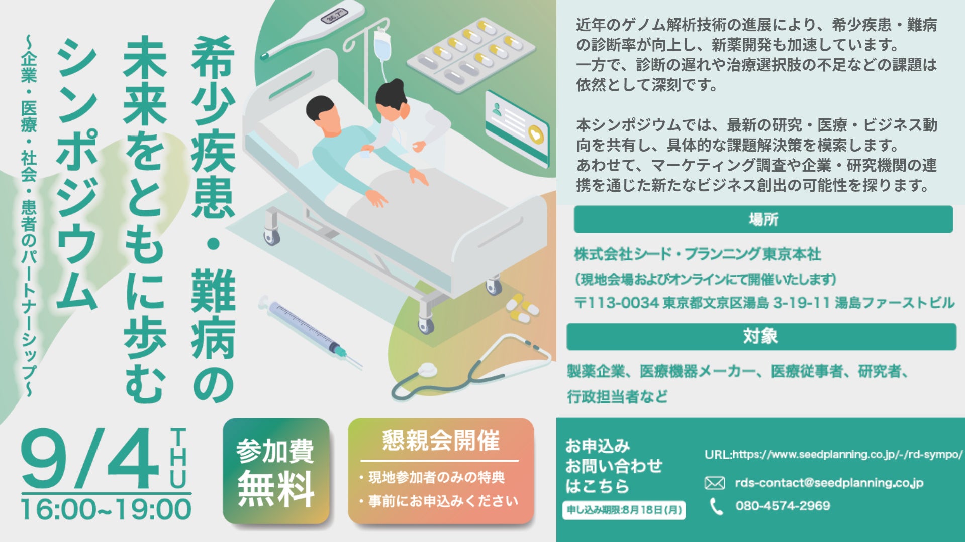 株式会社シード・プランニング(本社:東京都文京区、代表取締役社長:梅田 佳夫)は2025年9月4日(木)に製薬企業、医療機器メーカー、医療従事者、研究者、行政担当者などを対象とした「希少疾患・難病の未来をともに歩むシンポジウム~企業・医療・社会・患者のパートナーシップ~」 を開催します。