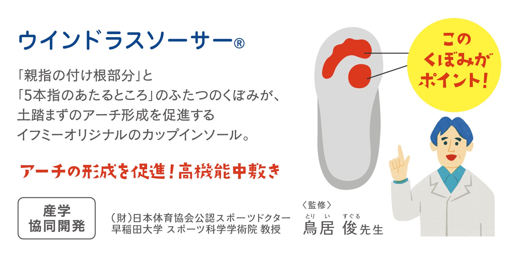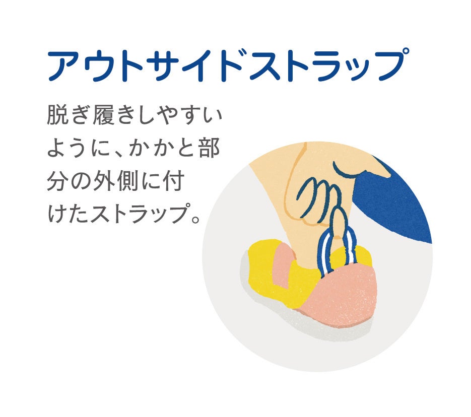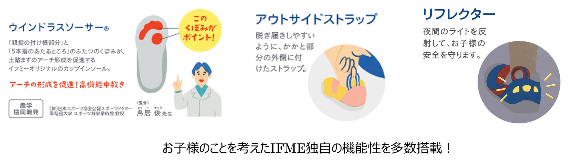 子ども自身での履きやすさに配慮した「アウトサイドストラップ」や、子どもの健やかな足の成長を育むインソール「ウィンドラスソーサー ®」など IFME のオリジナル機能を搭載しています。