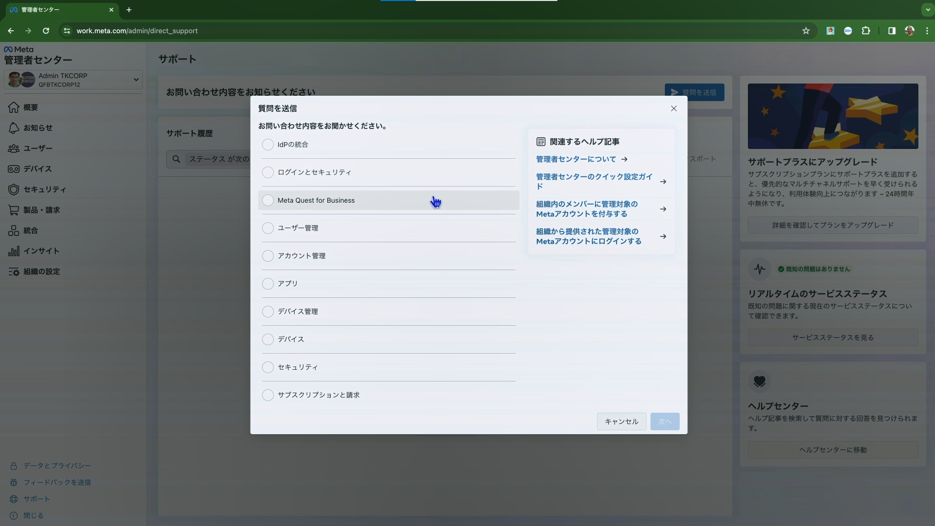 管理ページから直接Meta Quest for Businessに関するサポートを受けることができます。