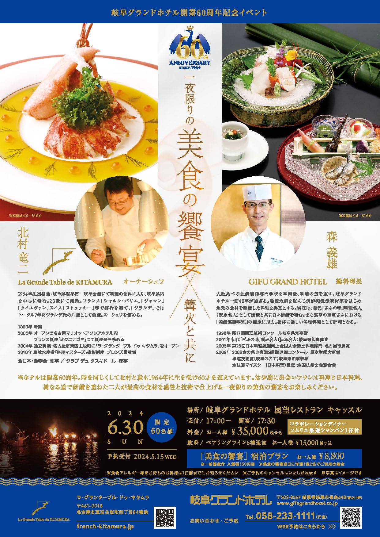 岐阜グランドホテル(岐阜市長良川畔 代表取締役社長 岩瀬正明)は、2024年6月30日に、開業60周年記念イト“一夜限りの「美食の饗宴」~篝火と共に~”を開催します。