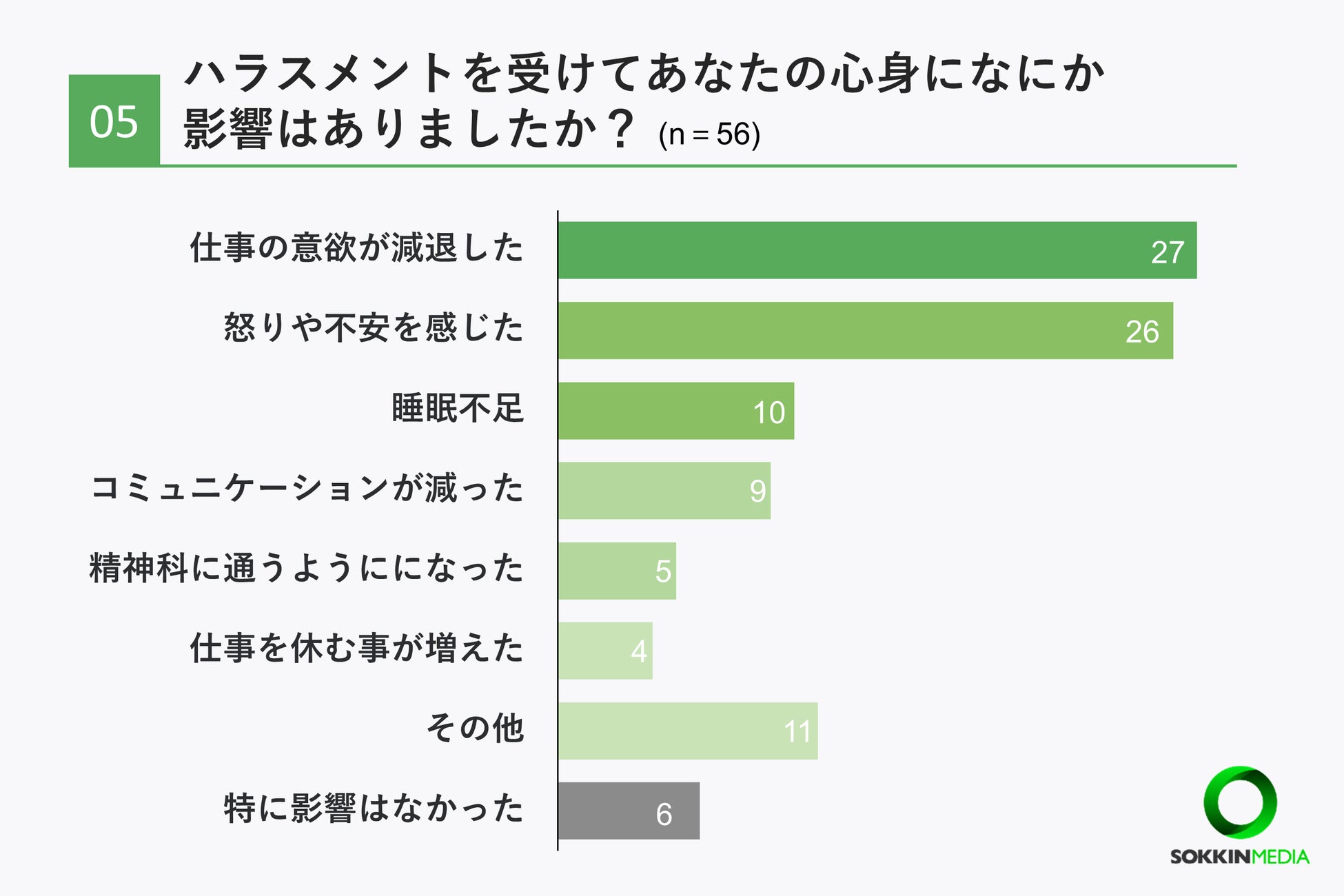 「Q5. ハラスメントを受けてあなたの心身になにか影響はありましたか?」という問いに対して、「仕事の意欲が減退した」と回答した方が最も多く27票、次いで「怒りや不安を感じた」という回答が26票という結果になりました。