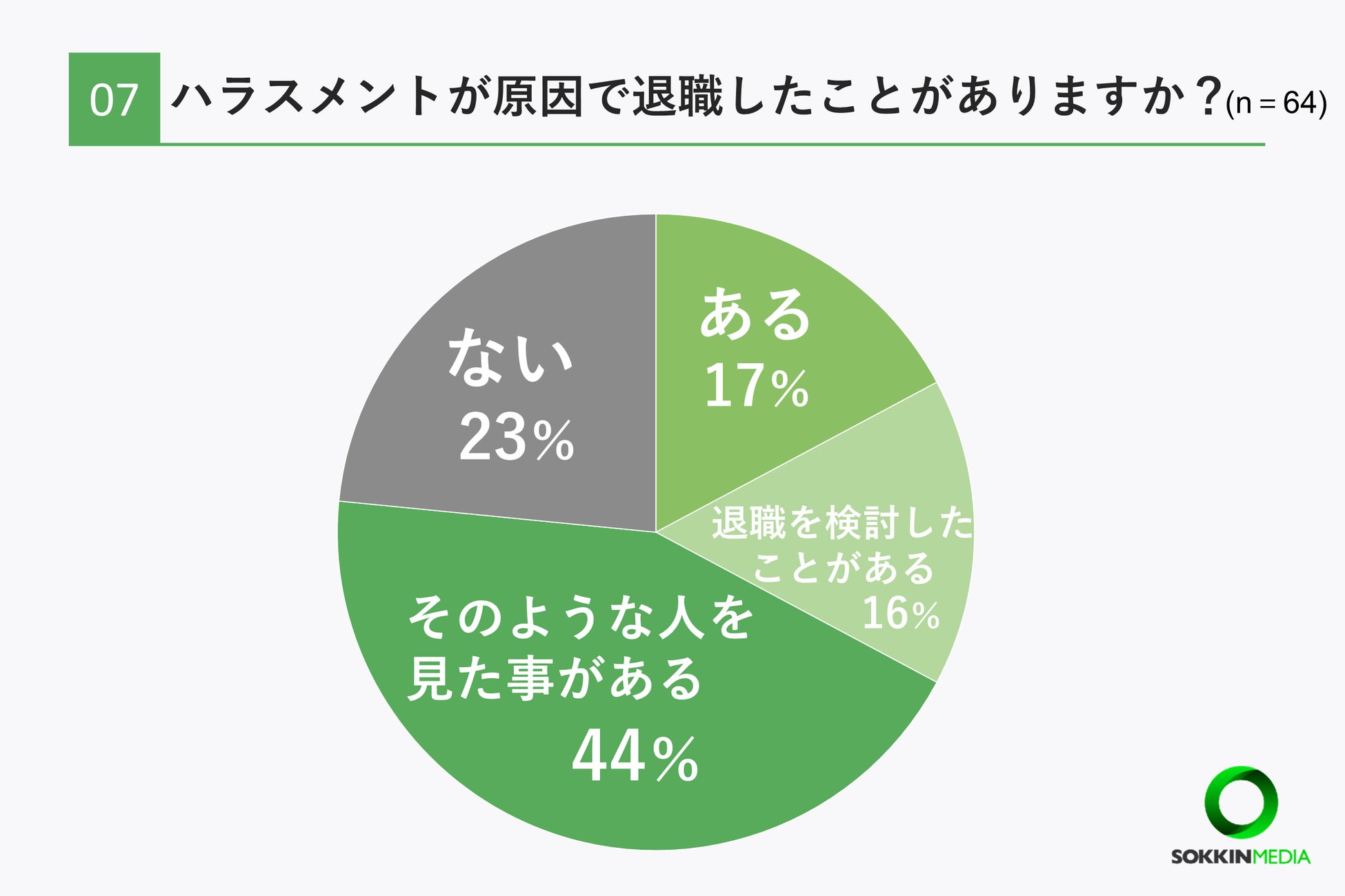 「Q7. ハラスメントが原因で退職したことがありますか?」という問いに対して、「そのような人を見た事がある」という回答が44%で最多という結果になりました。次いで「ある」という回答が17%でした。