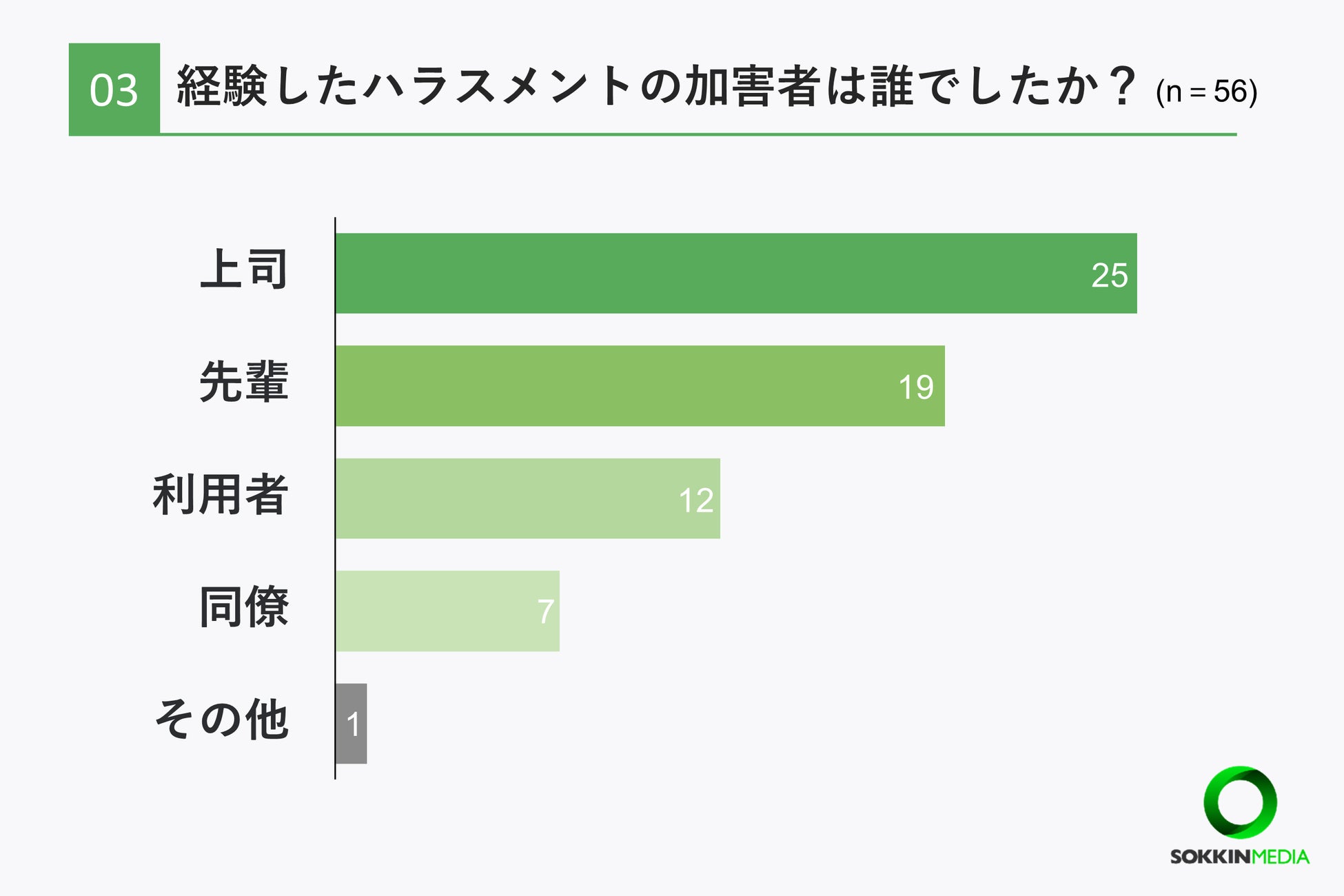 「Q3. 経験したハラスメントの加害者は誰でしたか? 」という問いに対して「上司」という回答が25票、次いで「先輩」が19票という結果になりました。また「利用者」も12票と多く見られました。