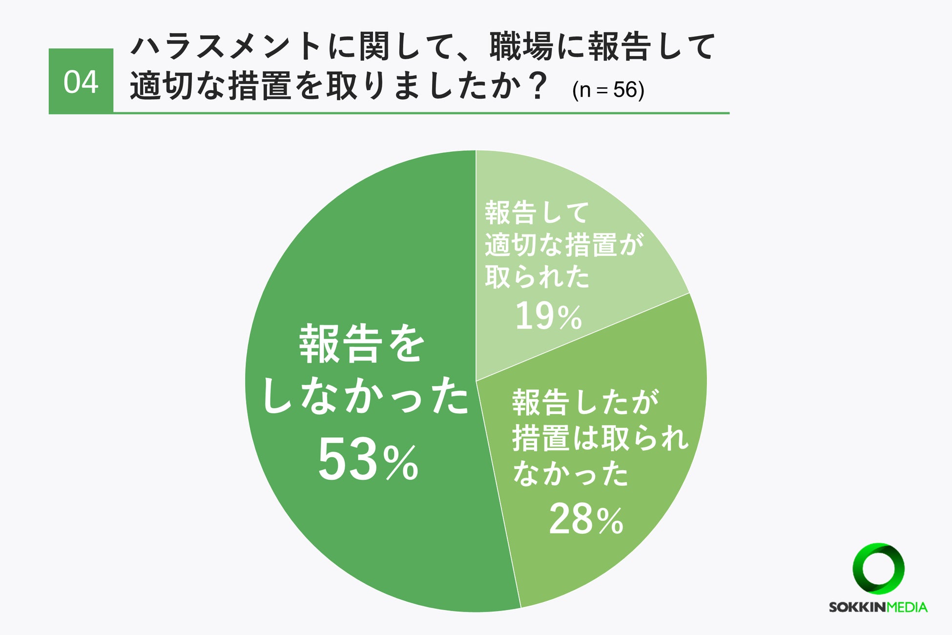 「Q4. ハラスメントに関して、職場に報告して適切な措置を取りましたか?」という問いに対して、「報告をしなかった」という回答が53%で最多という結果になりました。次いで「報告したが、適切な措置は取られなかった」が28%で、全体として81%がハラスメントに関して適切な措置が取られなかったということがわかりました。