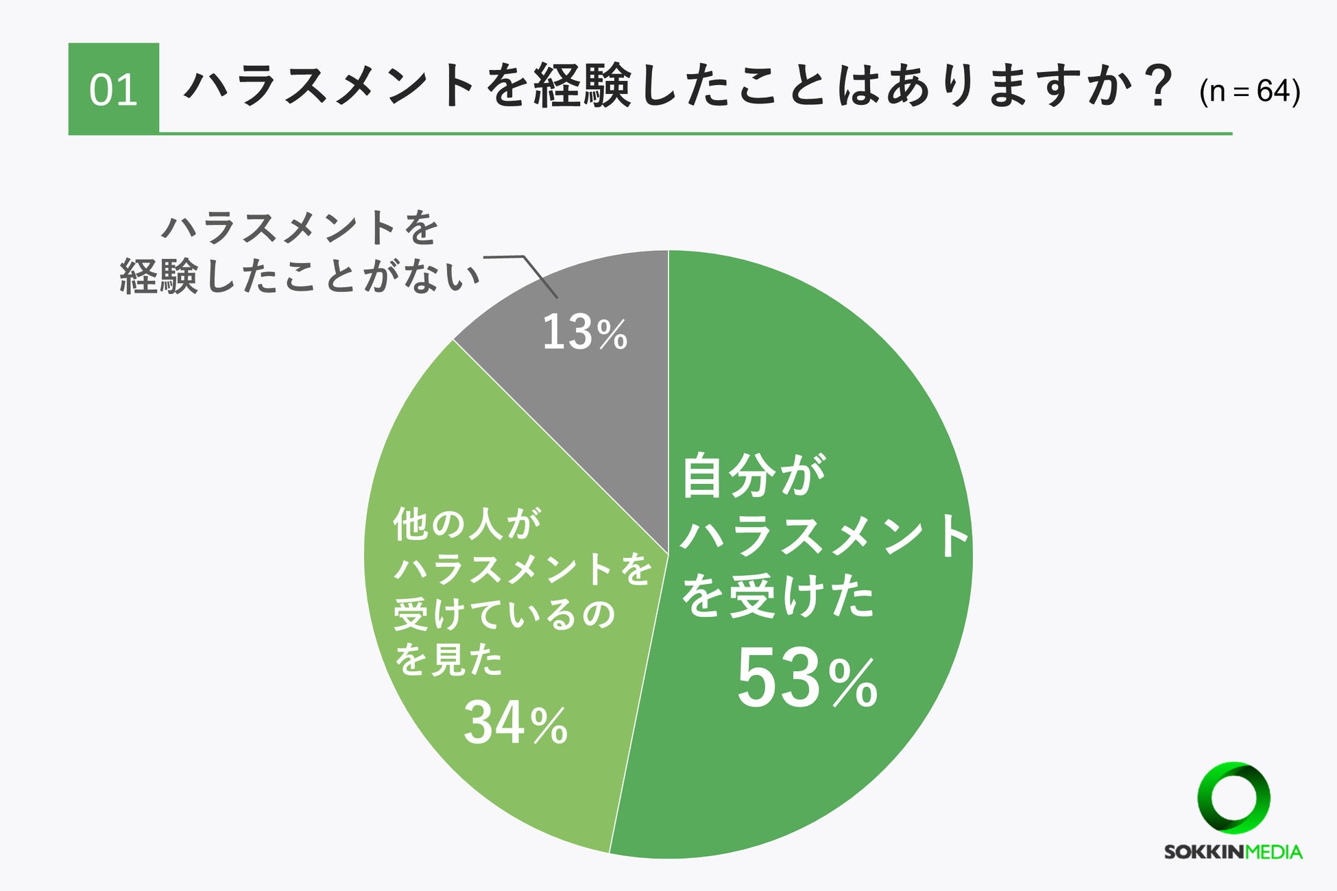 「Q1. ハラスメントを経験したことはありますか? 」という問いに対して、「自分がハラスメントを受けた」という方が53%、次いで「他の人がハラスメントを受けているのを見た」という方が34%という結果になりました。