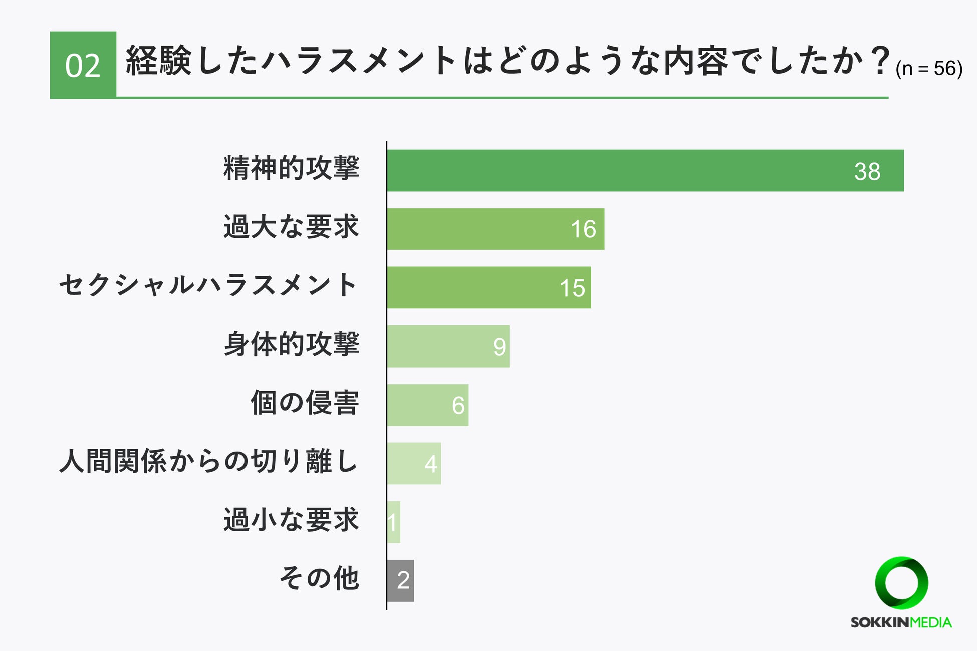「Q2. 経験したハラスメントはどのような内容でしたか? 」という問いに対して「精神的攻撃」が38票と最も多く、次いで「過大な要求」が16票という結果になりました。