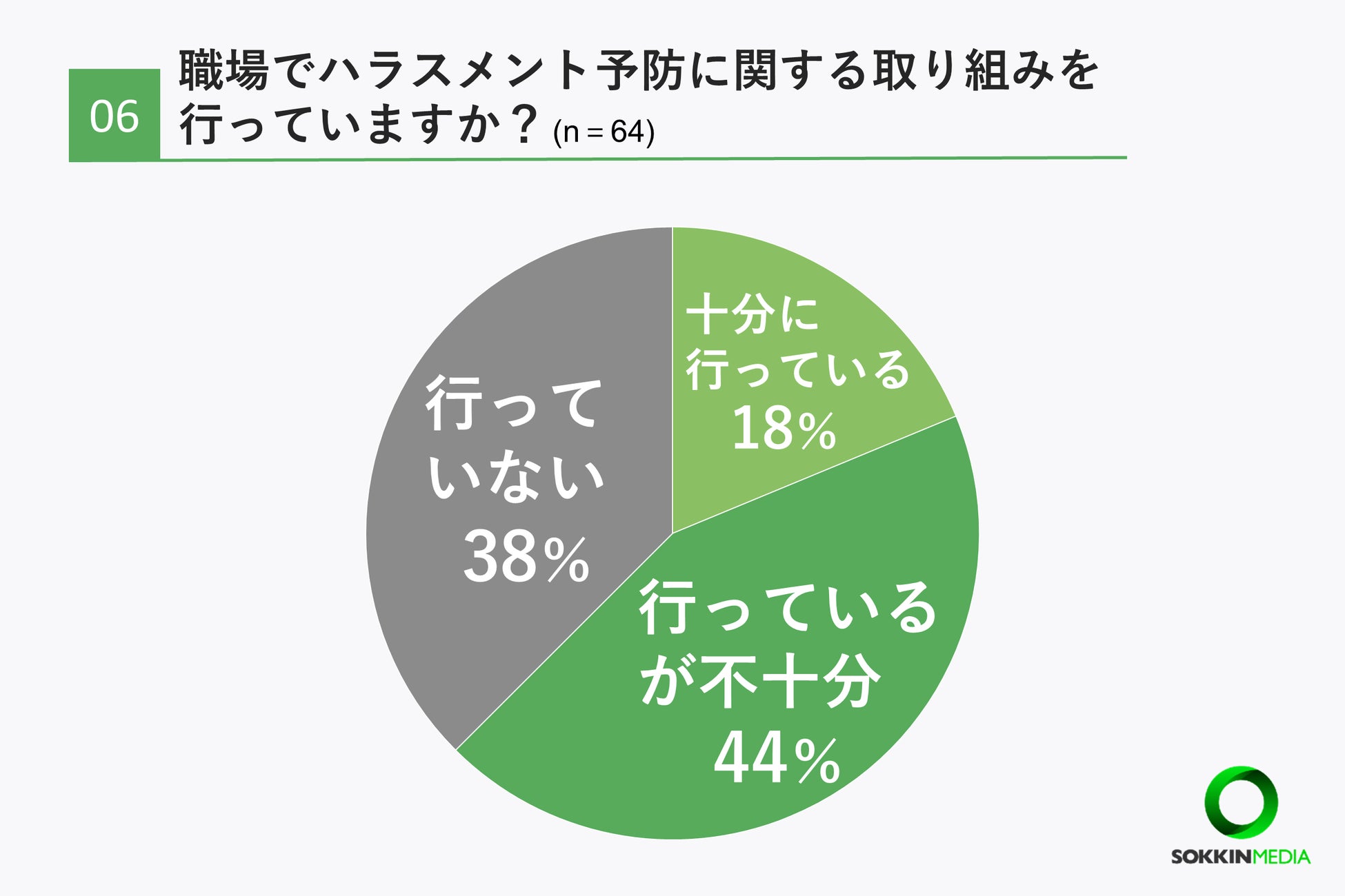 「Q6. 職場でハラスメント予防に関する取り組みを行っていますか?」という問いに対して、「行っているが不十分」が最多の44%、次いで「行っていない」という回答が38%という結果になりました。
