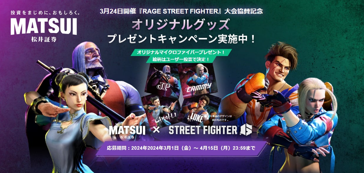 キャンペーン期間中に松井証券総合口座とFX口座の新規開設で「ストリートファイター6」のキャラクターがデザインされたオリジナルのモニタークロスをプレゼントします。景品のデザインとなるキャラクターは、後日投稿するX上でのユーザー投票で実施しますので、松井証券公式Xアカウント(https://twitter.com/Matsui_PR)をフォローしてお待ちください。