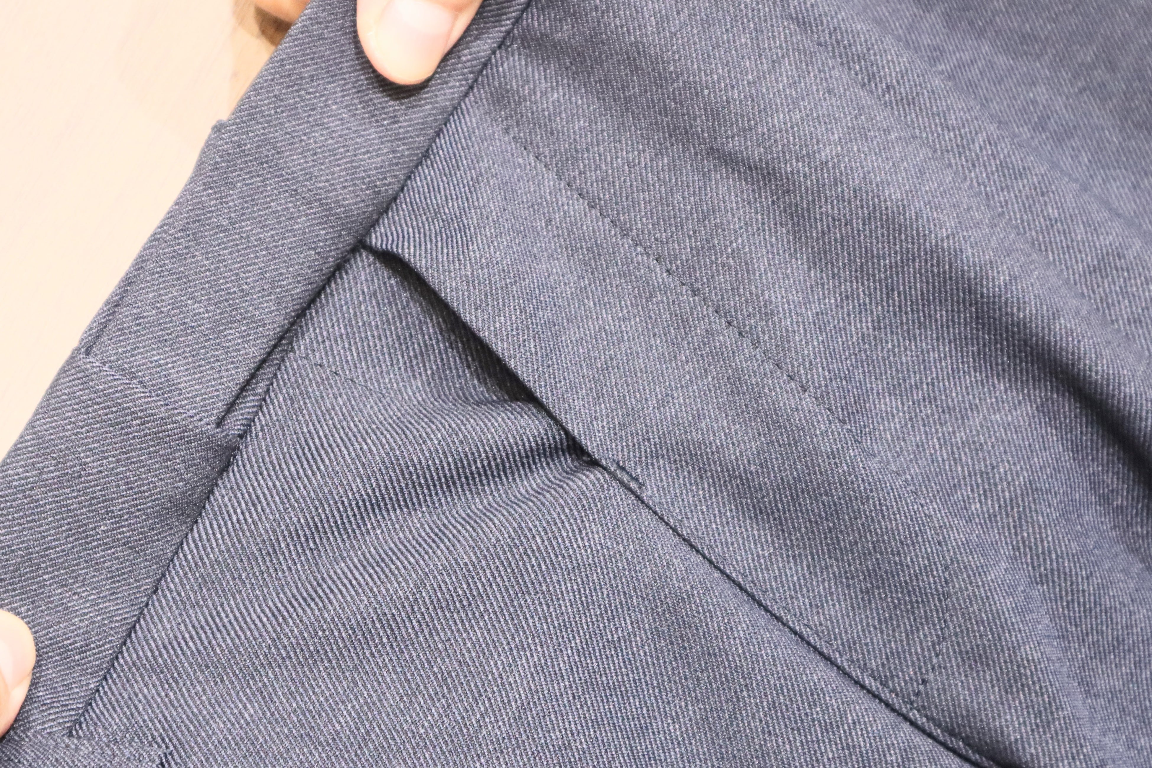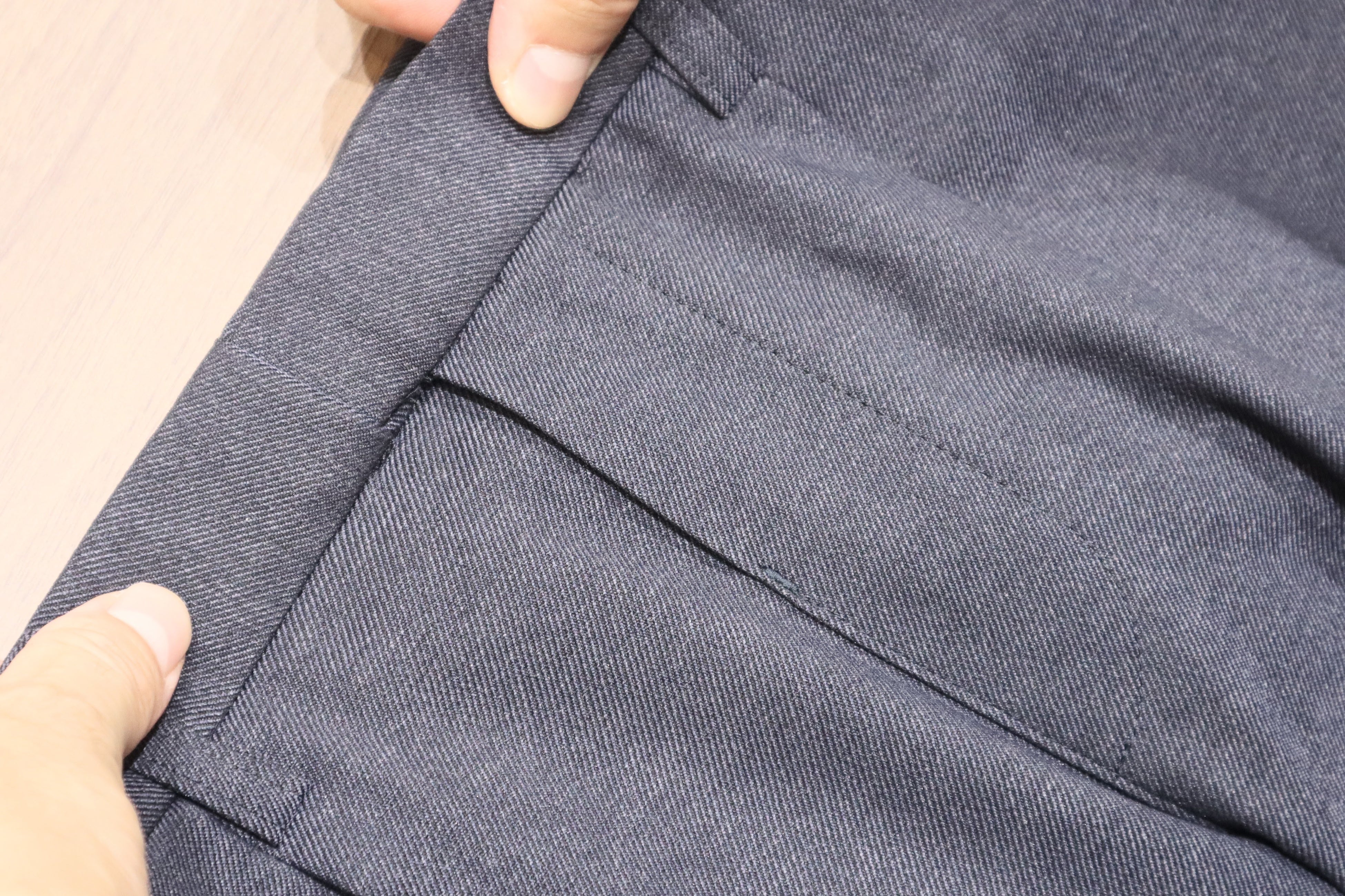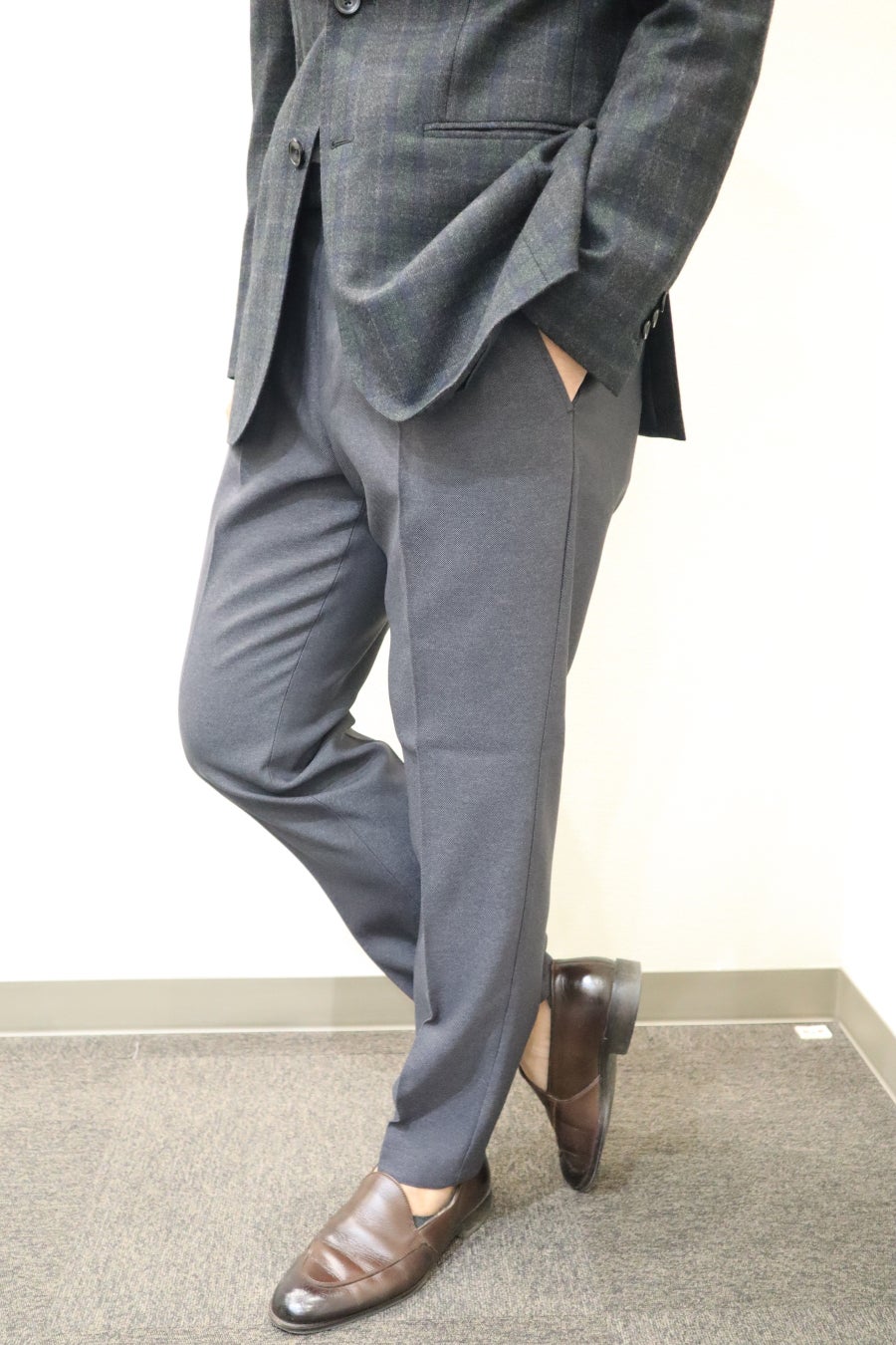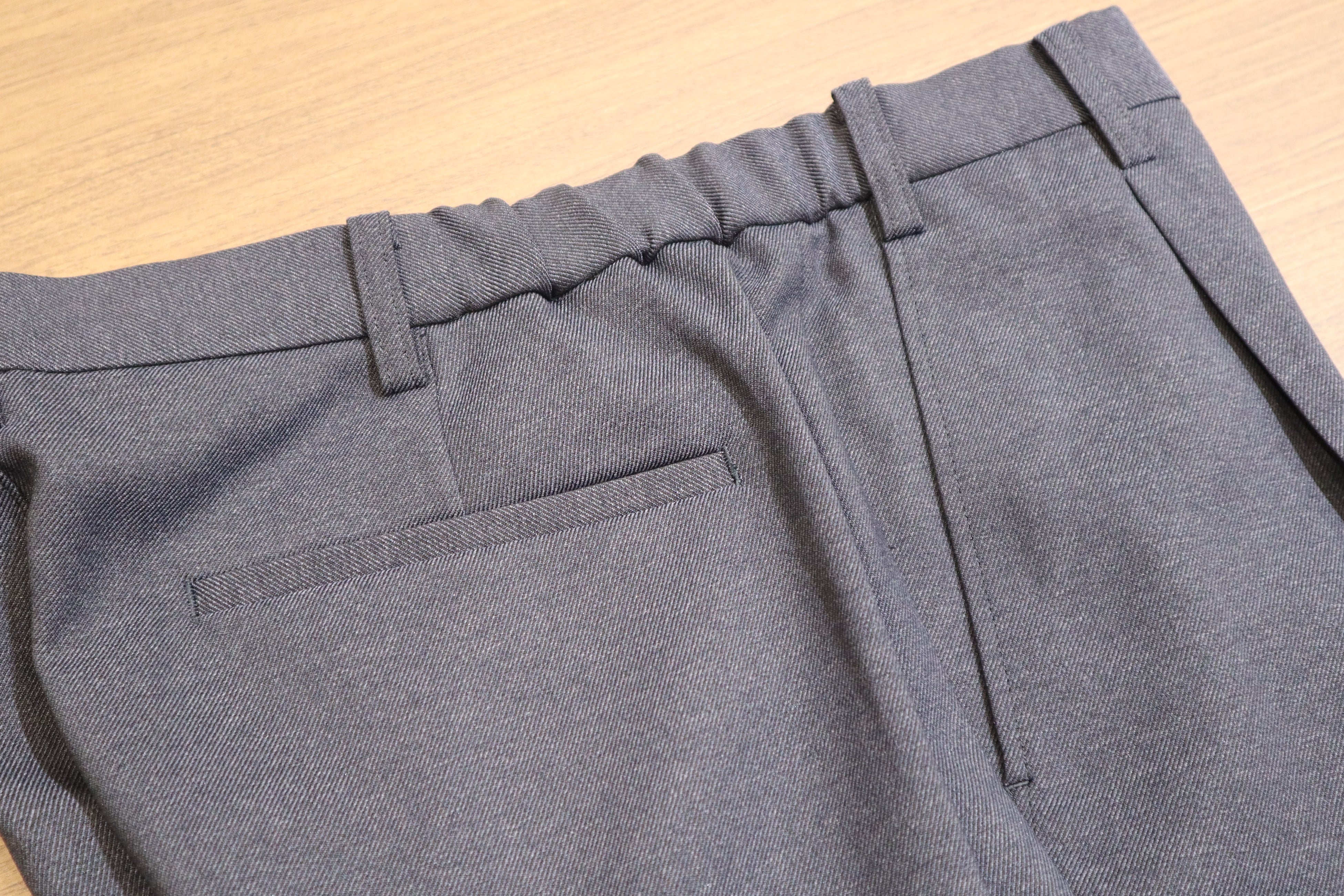昨今のビジネススタイルの多様化により、カジュアルな装いも選択肢の一つになっています。そのような中で、ビジネスシーンにおいてもスウェットパンツのように、楽で快適な履き心地でありながらも、キレイ目な服装にも合わせやすい“進化系カジュアルパンツ”を企画しました。今回のポイントは、スウェットのような着用感を実現するため、フロントホックやファスナーなどの伸縮性を妨げる付属品を省いてます。フロントの表と裏部分には、スライドして伸びるゴムに加えて、ウエストサイド部分にもシャーリングゴムを取り付けているため、座った時の窮屈感を軽減し快適に着用できます。また、前立て部分を完全に閉じてしまうと伸長率が弱くなるため少し開いているものの、座った時に前立て部分の生地が浮かないように何度も調整を行っており、ビジネスシーンで使いやすいスラックスにするために、フロント部分にダミーでファスナー風の縫い付けを施してます。